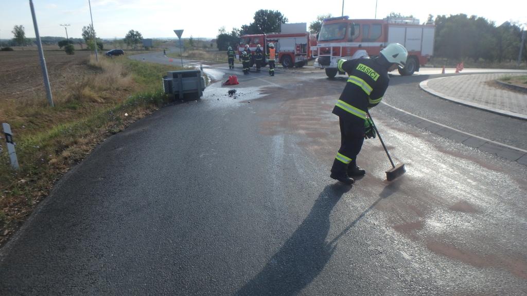 Z nákladního vozu spadl transformátor, kvůli vyteklému oleji byla uzavřena silnice v Chlumci nad Cidlinou