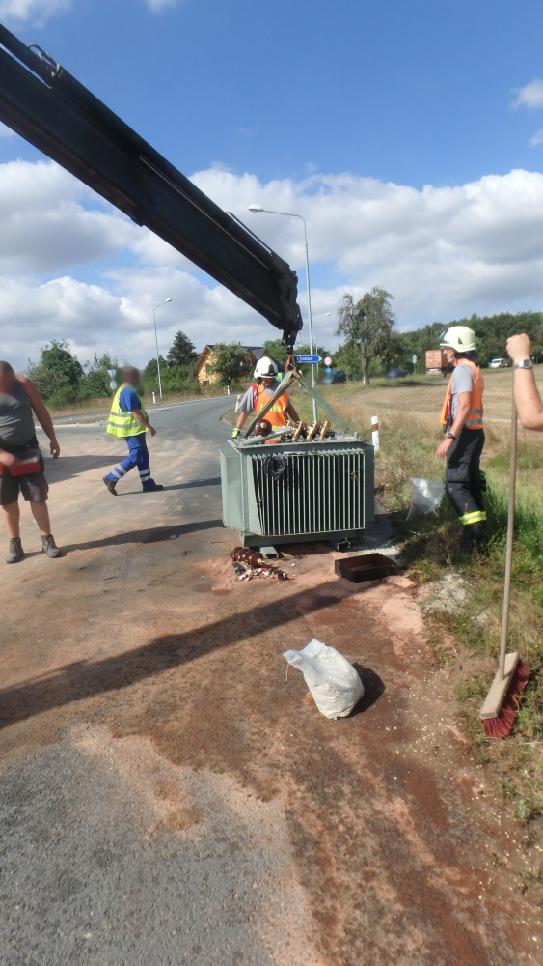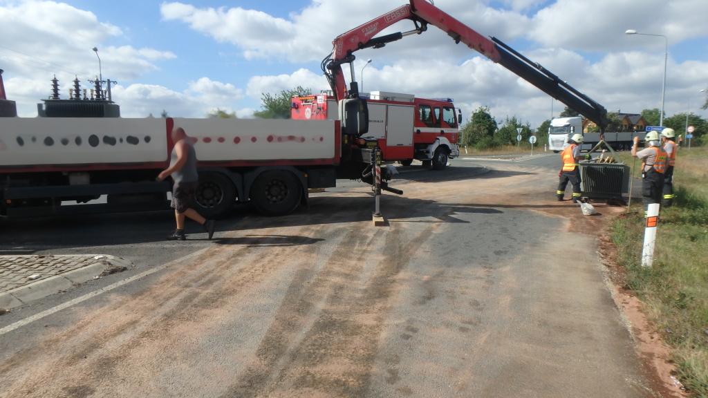 Profesionální jednotka z Nového Bydžova a dobrovolná jednotka z Chlumce nad Cidlinou vyjely 15. 8. 2018 do Pražské ulice, kde z korby nákladního automobilu spadl téměř dvoutunový transformátor.