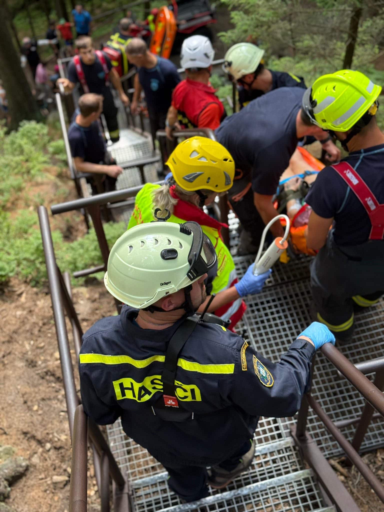 Zásah si vyžádal kombinaci záchranářských dovedností, techniky a fyzické zdatnosti. Po stabilizaci zraněného pod lékařským dohledem proběhl náročný transport po strmém schodišti. Při přesunu byly využity speciální nosítka a postup po schodech vyžadoval maximální opatrnost i sílu. Ve spodní části schodiště čekala terénní šestikolka, která zraněného převezla k sanitce u vstupu do skal.