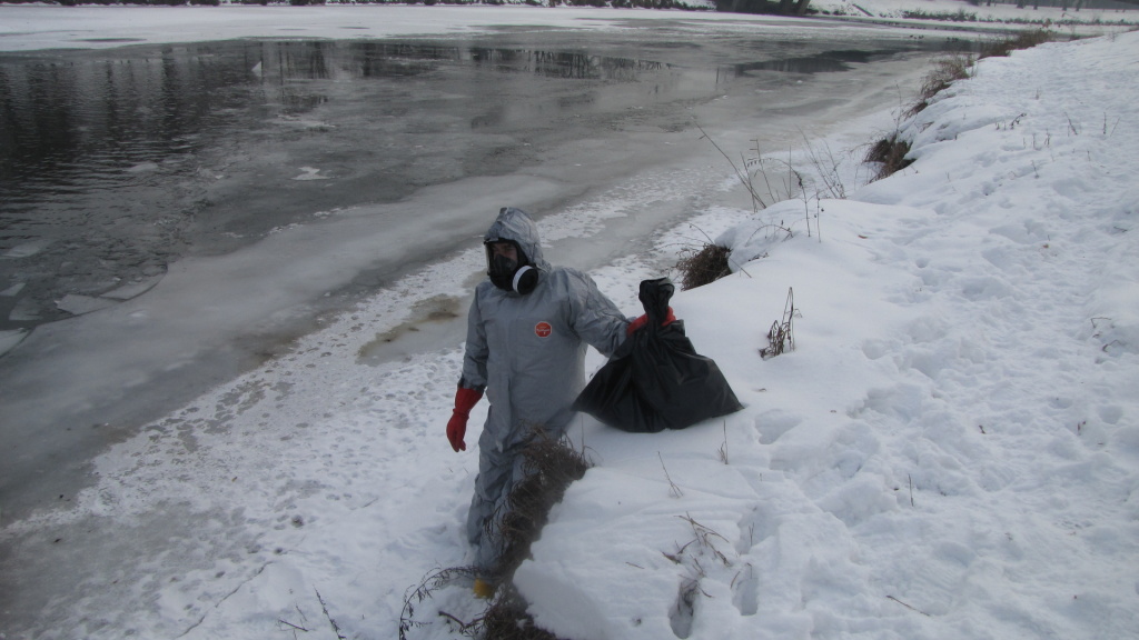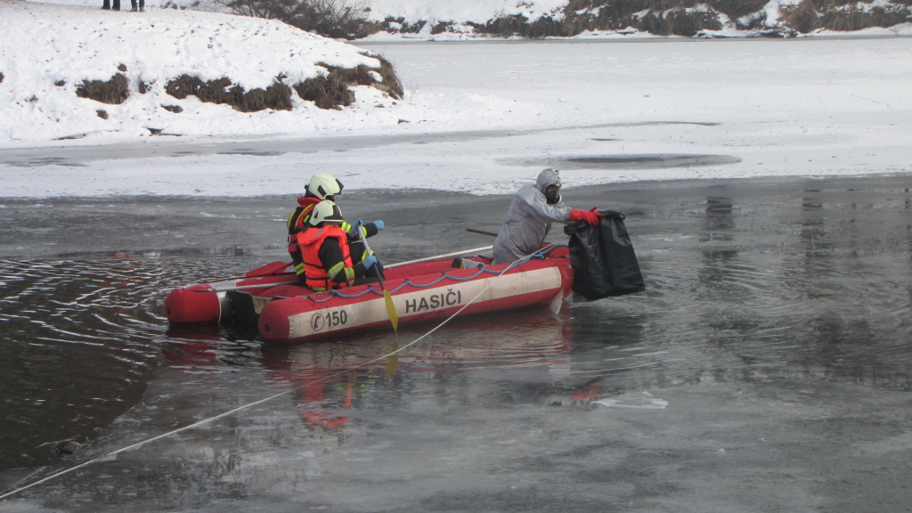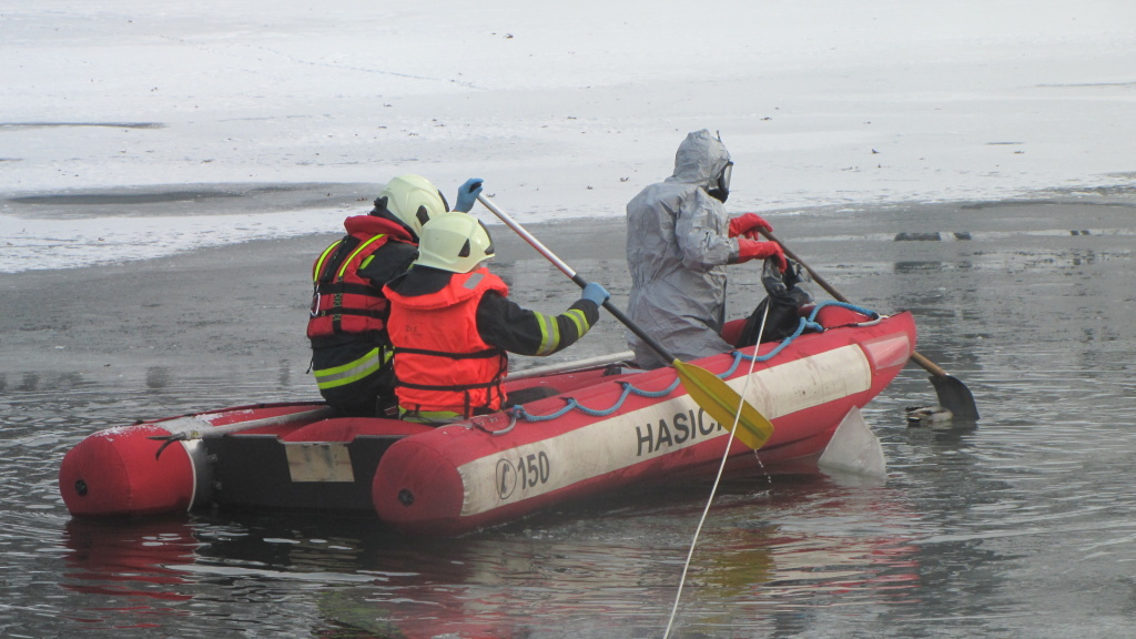 Jednotka profesionálních hasičů z centrální stanice Hradec Králové byla v sobotu ve 12:55 hodin přivolána k vylovení dvou uhynulých kachen na soutoku řek Labe a Orlice v Hradci Králové. Hasiči se v nafukovacím člunu dostali až k uhynulým ptákům a jeden z nich v jednorázovém obleku je odebral do pytle. Ten byl následně předán pracovníkům technických služeb. (foto: centrální stanice Hradec Králové)