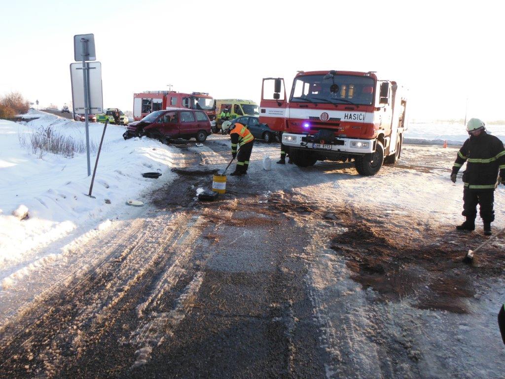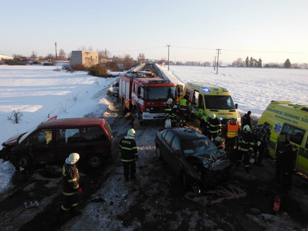 V neděli 22. ledna 2017 odpoledne byla na operační středisko hasičů ohlášena vážná dopravní nehoda mezi Libonicemi a Dobrou Vodou. Na místo události vyjeli v 15:18 hodin profesionální hasiči z Hořic a Jičína, dále dobrovolní hasiči z Hořic. Po příjezdu na místo bylo zjištěno, že na silnici č. III/3267 došlo k čelnímu střetu dvou osobních vozidel. Dvě zraněné osoby se v době příjezdu hasičů nacházely uvnitř havarovaných aut. Hasiči jim poskytli nezbytnou předlékařskou pomoc a vyprostili je z vozidel. Po příjezdu záchranářů byli zranění lidé předáni do jejich péče. Další dva lidé byli bez zjevných známek zranění venku. Hasiči zajistili obě vozidla proti požáru a odpojili autobaterie. Na únik většího množství provozních kapalin hasiči použili speciální nádoby, které umístili pod vozidlo a současně použili sorbent na jejich zasypání. Po zadokumentování události Policií ČR pomohli s naložením vraků na odtah a odklidili z vozovky použitý sorbční materiál. Příčiny nehody a míru zavinění šetří Policie ČR. (foto: stanice Hořice)