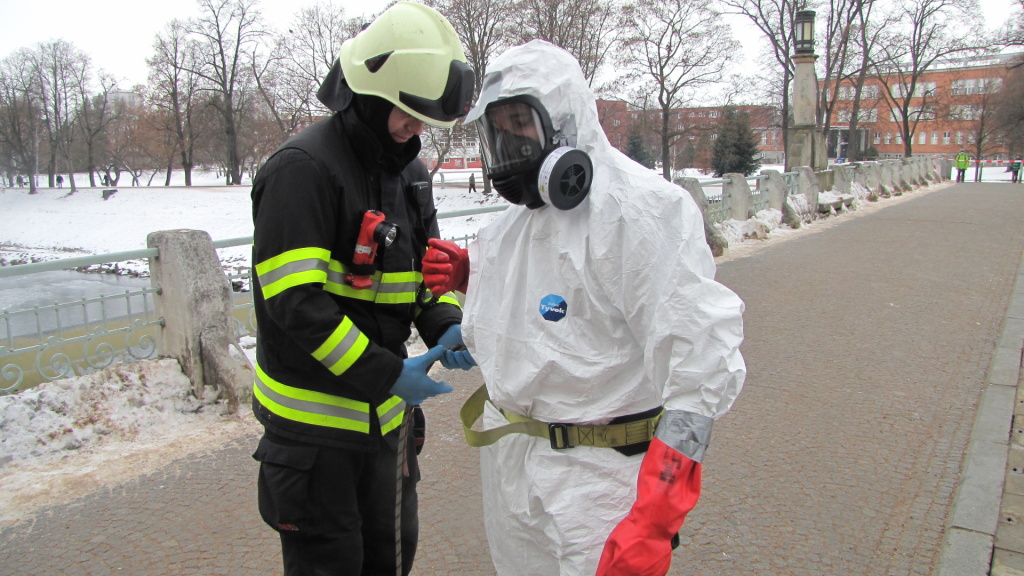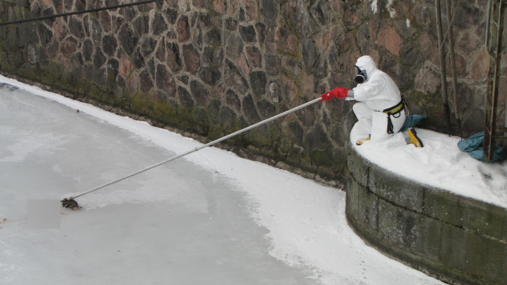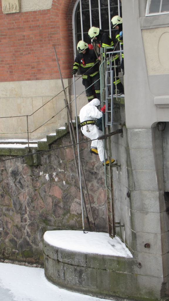 K vyproštění uhynulé kachny vyjeli ve 13:07 hodin královéhradečtí profesionální hasiči z centrální stanice k vodní elektrárně Hučák v Hradci Králové. Kachna se nacházela zhruba tři metry od břehu na ledu. Hasič v jednorázovém obleku a za pomocí trhacího háku přitáhl uhynulého ptáka ke břehu. Uložil ho do pytle a předal pracovníkům technických služeb. (foto: centrální stanice Hradec Králové)