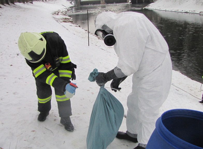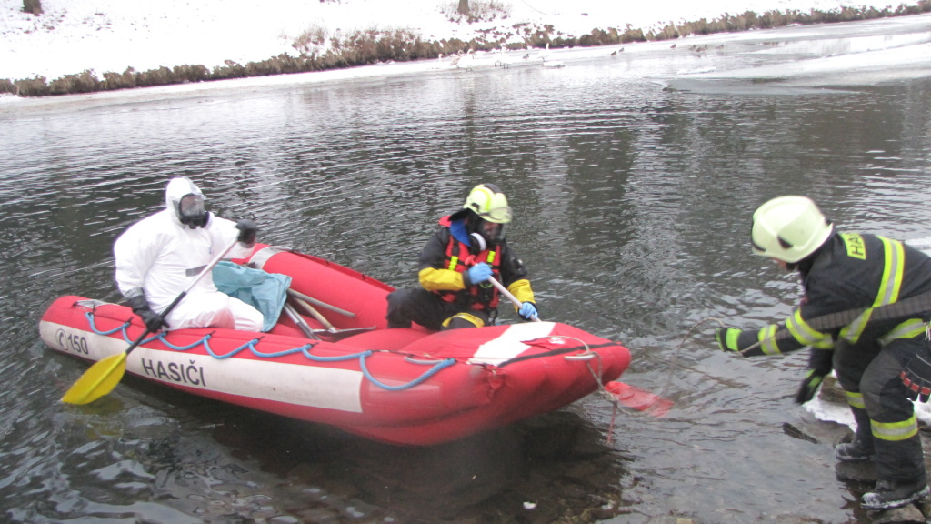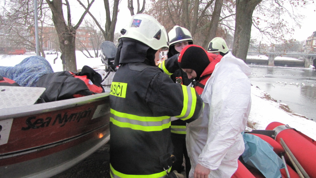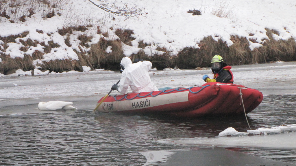 Krátce před půl osmou ráno byli hasiči z centrální stanice Hradec Králové přivoláni k odběru uhynulé labutě na Labi u vodní elektrárny Hučák v Hradci Králové. Hasiči se na člunu dostali k ledové kře, kde se nacházel uhynulý pták. Jeden z hasičů v ochranném jednorázovém obleku odebral labuť do dvou pytlů, které následně předal pracovníkům technických služeb. (foto: centrální stanice Hradec Králové)