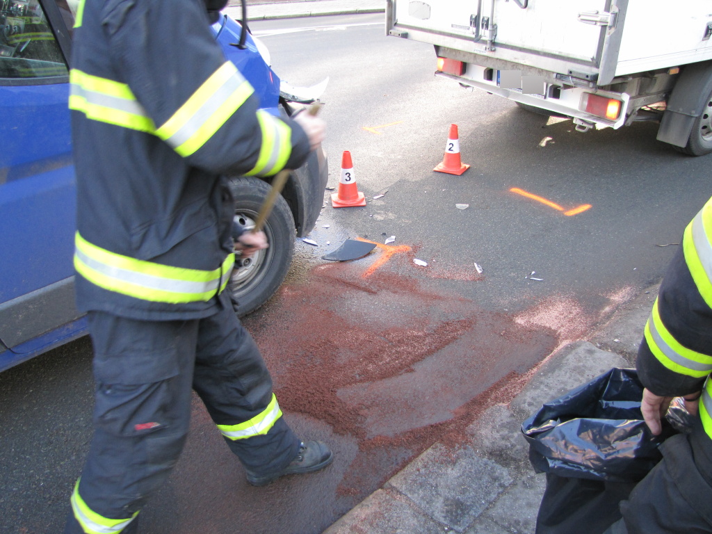 Bez zranění se obešla dopravní nehoda dvou dodávek, ke které došlo krátce po osmé hodině ráno na křižovatce ulic Komenského a I. Herrmanna v Hradci Králové. Na místo události vyjeli profesionální hasiči z centrální stanice Hradec Králové s rychlým zásahovým automobilem a cisternou. Oba řidiči vyvázli bez zranění. Hasiči u jedné z dodávek odpojili autobaterii a po zadokumentování události Policií ČR zasypali uniklé provozní kapaliny. Po vyšetření nehody odtlačili jednu z dodávek mimo vozovku. (foto: centrální stanice Hradec Králové)