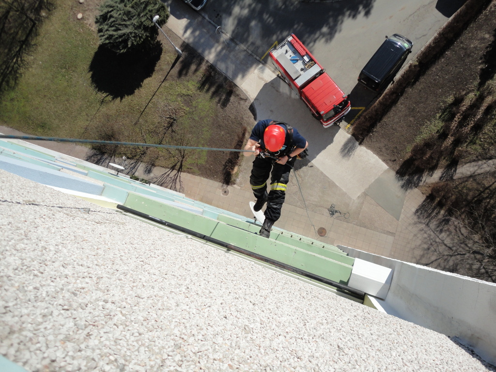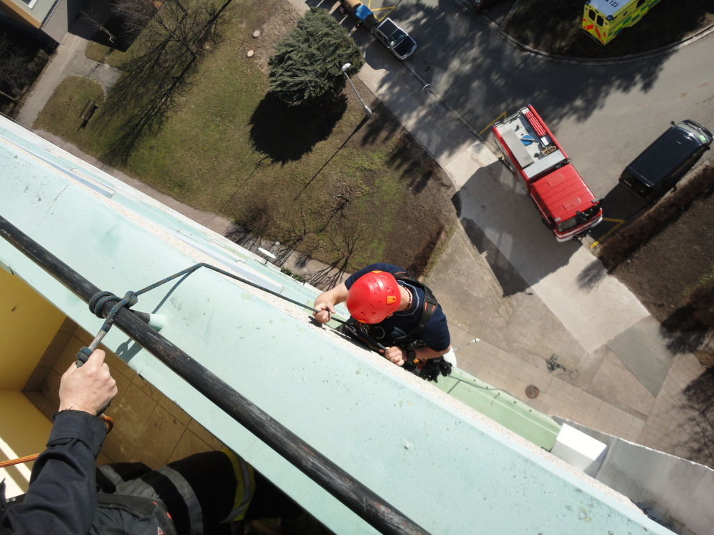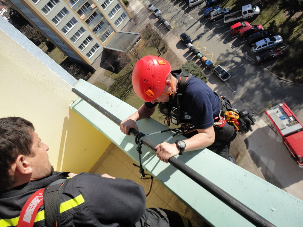 K nouzovému otevření bytu v hradecké ulici Na Kotli, ve kterém se nacházela zraněná žena vyjeli včera v 11:30 hodin profesionální hasiči z centrální stanice Hradec Králové. Do bytu se nebylo možné dostat bez poškození dveří, proto hasiči zvolili variantu slanění z balkonu ve vyšším patře. Hasič – lezec se pomocí lezeckého vybavení slanil k bytu a pomocí speciálního nářadí otevřel balkónové dveře. Poté vpustil do bytu lékaře se záchranáři. Ti ženu s vážnými zdravotními potížemi ošetřili a zajistili. Hasiči pomohli s jejím naložením na nosítka a transportem do sanity. (foto: centrální stanice Hradec Králové)