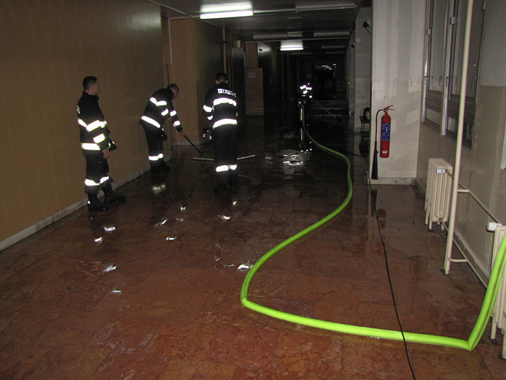 Jednotka profesionálních hasičů z centrální stanice Hradec Králové byla v 01:03 hodin přivolána do budovy Fakulty vojenského zdravotnictví Univerzity obrany v Třebešské ulici, kde došlo k masivnímu úniku vody. Tekoucí voda z poškozeného hydrantu zatopila patro, schodiště i přízemí budovy. Hasiči nasadili dva speciální vysavače na vodu a kalové čerpadlo a zhruba pět centimetrů vody odčerpali. Menší množství vody po odčerpání vymetli košťaty a ručně vytřeli. (foto: centrální stanice Hradec Králové)