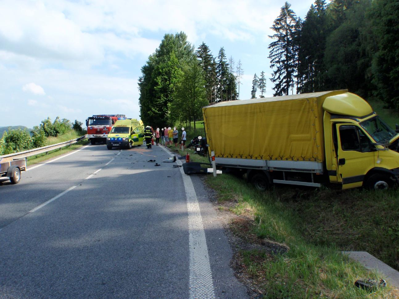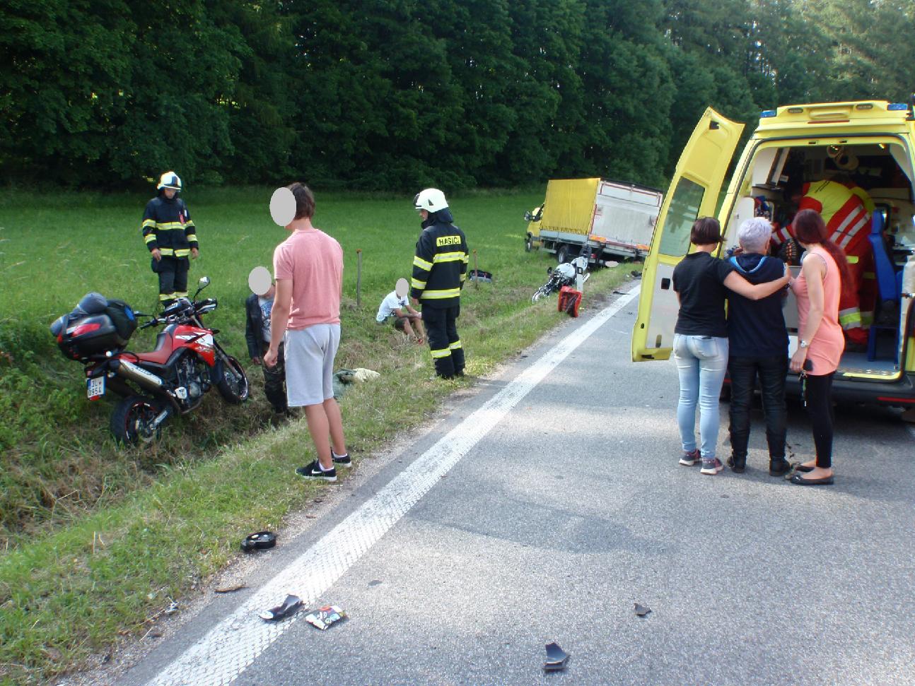 Nehoda dvou motocyklů a dodávky se obešla bez vážnějšího zranění