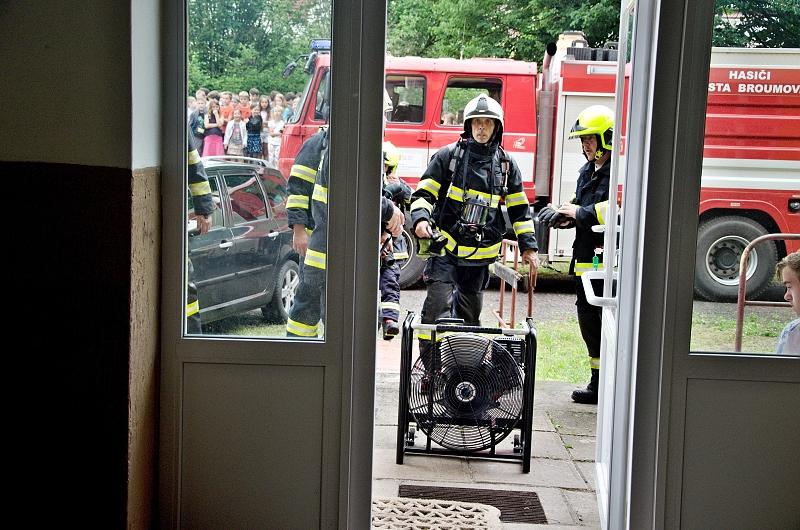 Broumovští profesionální hasiči, dobrovolní hasiči z Broumova a Meziměstí a podnikoví hasiči VEBA 01 Broumov se dopoledne (ohlášeno 8:32) zúčastnili taktického cvičení v základní škole v ulici Školní v Meziměstí. Námětem byl požár, který měl vypuknout v šatnách školy. Hasiči v dýchacích přístrojích evakuovali všechny dospělé osoby a děti, které se v budově nacházely. Poté jednotky využily k odvětrání prostor ventilaci.