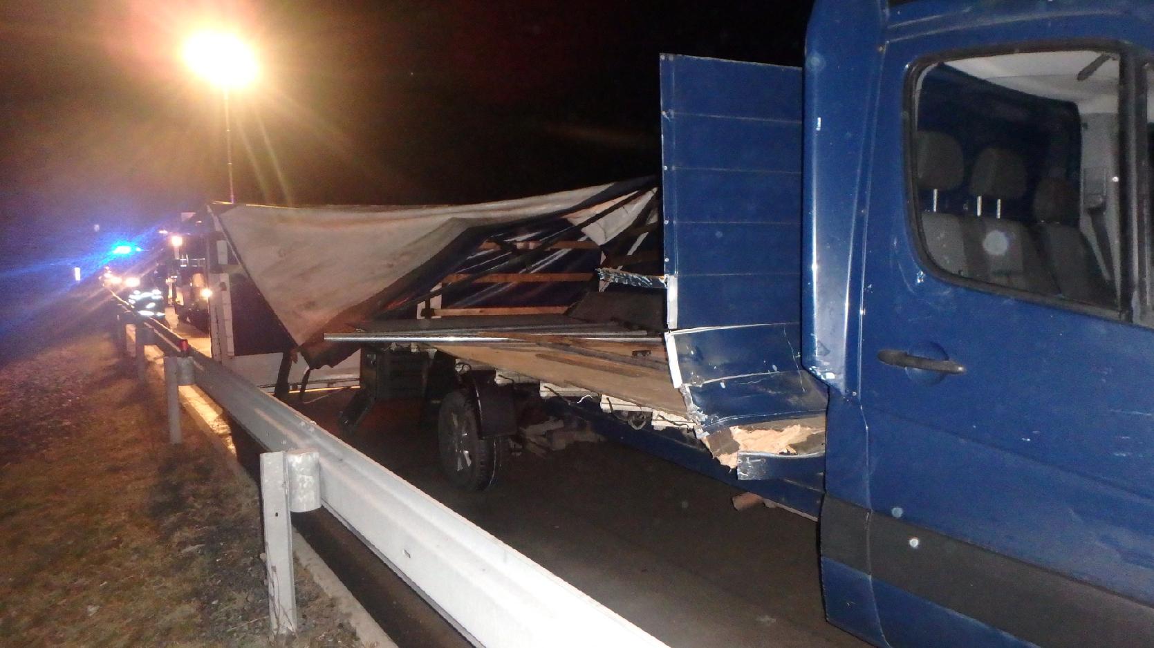 Profesionální hasiči z královéhradecké stanice Pražská a Nový Bydžov a dobrovolní hasiči z Chlumce nad Cidlinou byli v časných ranních hodinách přivoláni k dopravní nehodě dodávky a kamionu, která se stala na dálnici D11. Došlo k poškození návěsu. Hasiči rozebrali spadlou konstrukci a místo uklidili. Nikdo nebyl zraněn.
