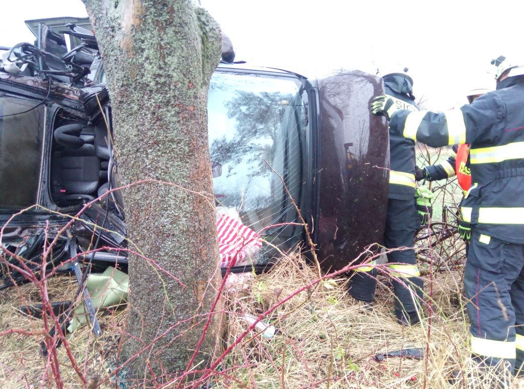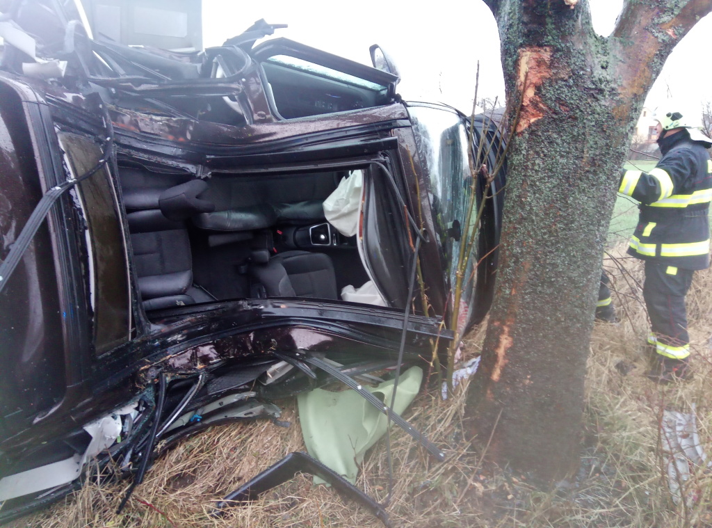 Osobní automobil vyjel ze silnice, narazil do stromu a zůstal zde převrácený na boku. Ve voze cestovala jedna osoba, která v něm zůstala zaklíněna. Hasičům se podařilo zraněného člověka ze zdemolovaného vozu vyprostit a předali jej do péče záchranářů. Ti ho následně transportovali do zdravotnického zařízení vrtulníkem letecké záchranné služby.