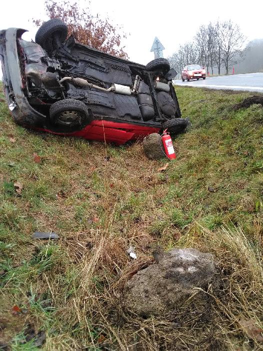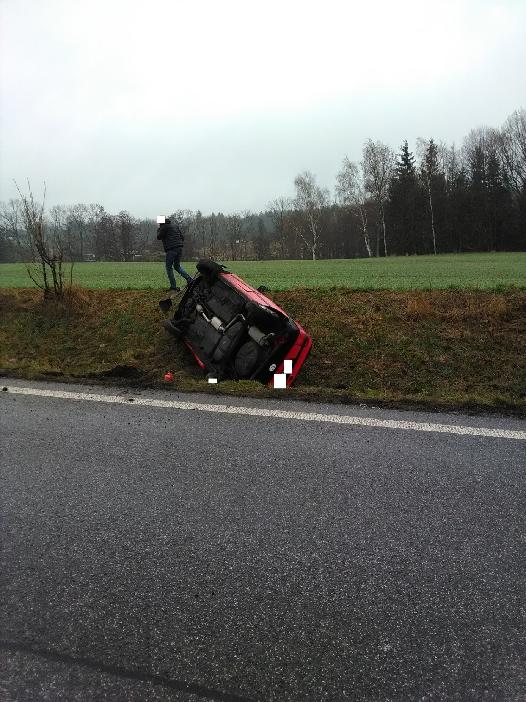 Královédvorští profesionální hasiči a dobrovolní hasiči z Hajnice vyjeli před polednem k osobnímu vozidlu, které havarovalo do příkopu. Vozidlo poškodilo dopravní značení a skončilo převrácené na střeše. Ke zranění osob nedošlo. Nehoda se stala na silnici mezi Kocbeřemi a Choustníkovým Hradištěm.
