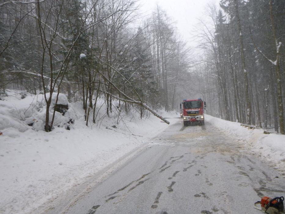 Odstranění stromu, který byl nakloněný nad komunikací a hrozil jeho pád. (HZS Trutnov, JSDH Horní Maršov)