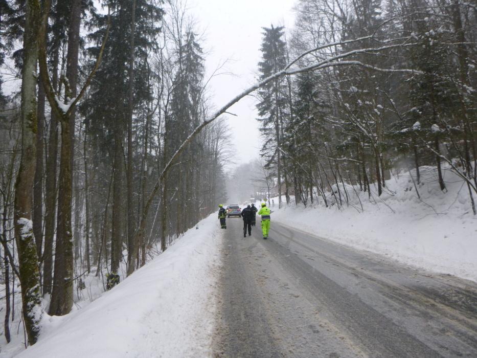 Další nebezpečně nakloněný strom řešili hasiči v Lesní ulici. Tentokrát hrozil pádem na blízký dům asi 20m dlouhý, v půlce nalomený strom. Kácení porostu by bylo v tomto případě velmi riskantní, proto jednotky strom zajistily proti pádu a oblast kolem něj ohraničily. Vlastník byl pak upozorněn na to, že je nutné porost odborně pokácet. (HZS Trutnov, JSDH Horní Maršov)