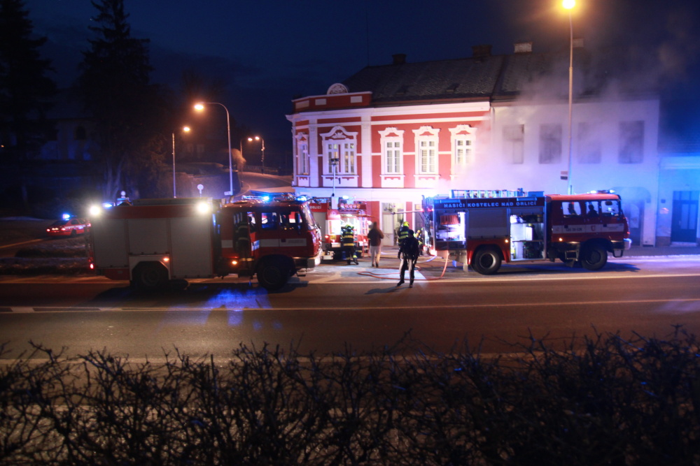 Tři jednotky požární ochrany byly zalarmovány kvůli nahlášenému požáru v obchodě v Komenského ulici v Kostelci nad Orlicí. Při příjezdu jednotek na místo události nebylo již plamenné hoření viditelné, ale objekt byl silně zakouřen. Z obytných prostor nad obchodem museli evakuovat hasiči čtyři osoby, všechny se dostaly ven v pořádku bez zranění.