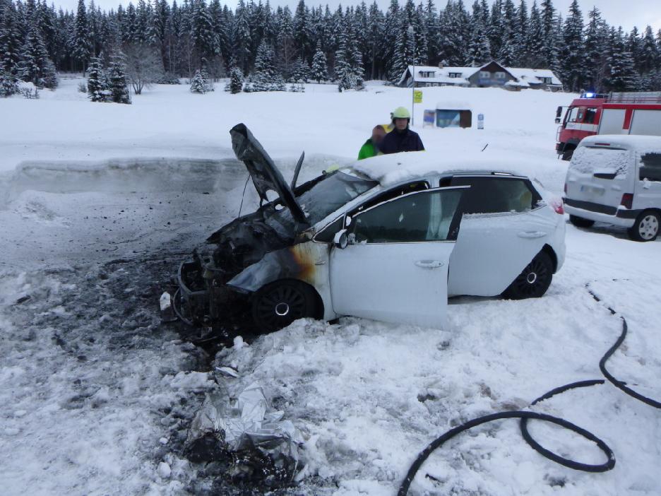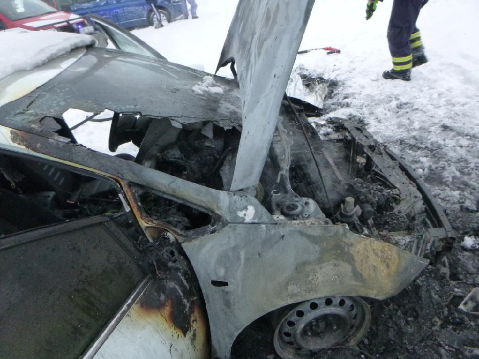 K nahlášenému požáru osobního vozidla spěchali k jednomu z penzionů profesionální hasiči z Trutnova a dobrovolná jednotka z Pece p. S. Už při příjezdu jednotek na místo se požár v motorovém prostoru rozvinul a zasáhl i levou část vozu.