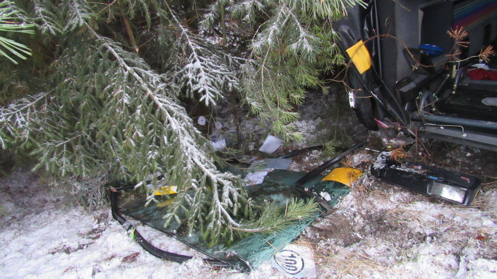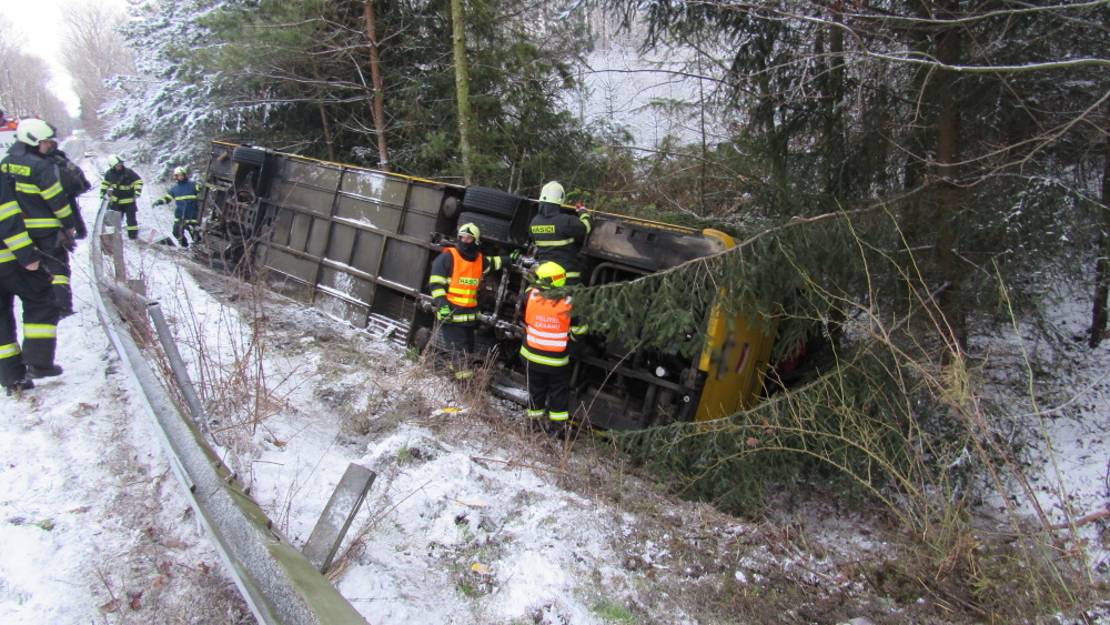 Autobus vyjel mimo komunikaci, poškodil svodidla a skončil převrácený na bok v hlubokém příkopu. V době nehody v něm cestovaly čtyři osoby včetně řidiče. Hasiči nemuseli nikoho z autobusu vyprošťovat, všichni lidé se dostali ven sami.