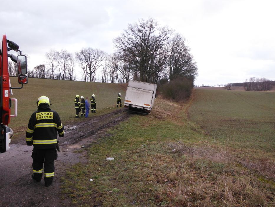 Profesionální jednotka z Hořic a jednotka podniku Čepro a.s. pomohly s vyproštěním nákladního automobilu, který najel na polní cestu, uvízl a zůstal stát nakloněný na bok.