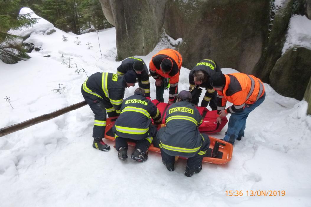 Při záchraně zraněné osoby z nepřístupného terénu v Adršpašských skalách spolupracovaly složky IZS. Na místo byl vyslán také vrtulník LZS se záchranáři a jedním hasičem-lezcem z centrální hradecké stanice na palubě. Společně byli připraveni provést záchranu zraněné osoby v podvěsu. Člověk se nacházel asi 1,5 kilometru od vchodu do skal na zledovatělém a neudržovaném terénu. Hasiči, kteří byli přímo ve skalách, nakonec osobu snesli k vozu a dopravili ji ke vchodu do skal, kde už čekal sanitní vůz. Na místě zasahovali profesionální hasiči z Broumova a dobrovolná jednotka z Adršpachu.