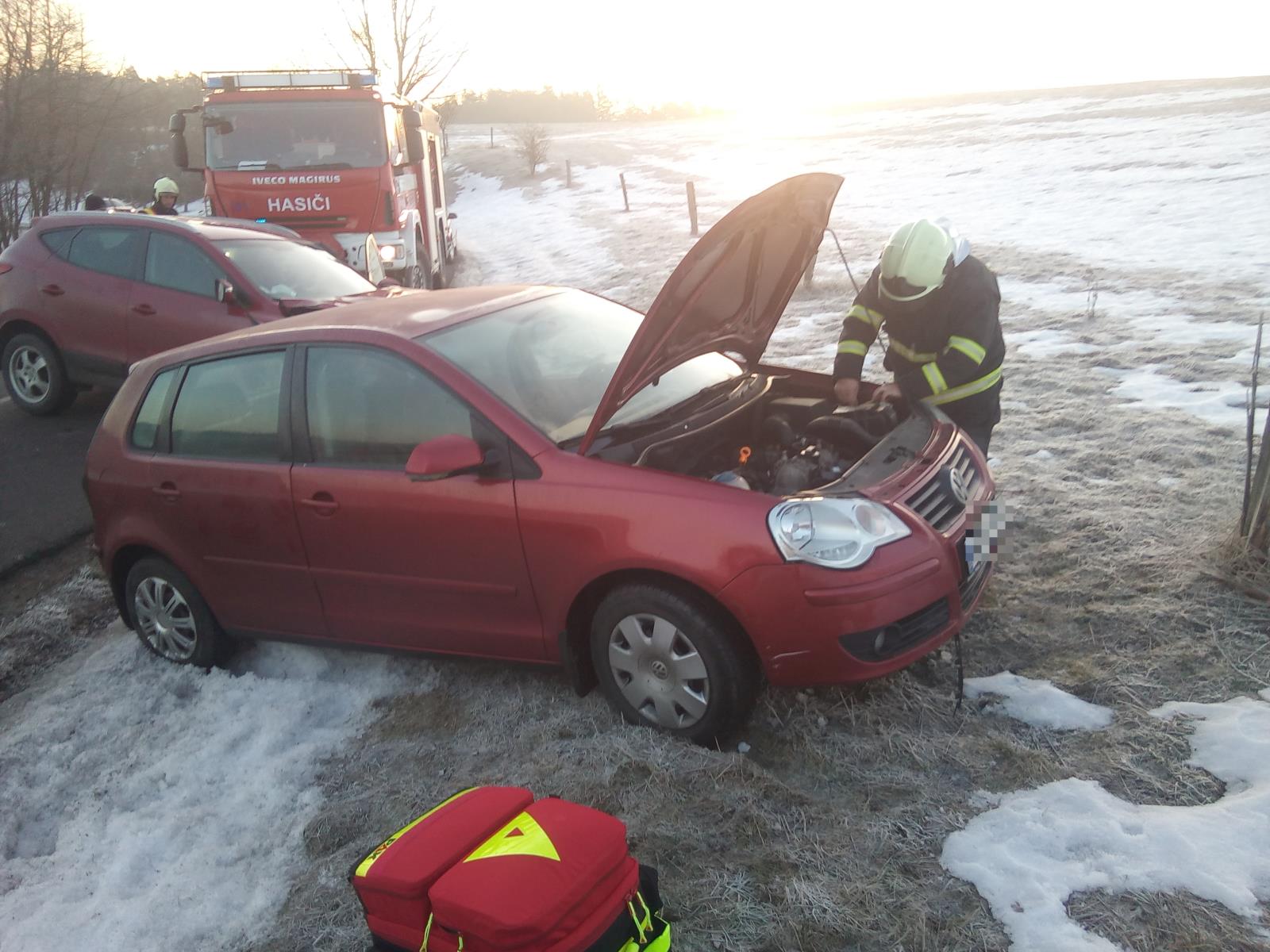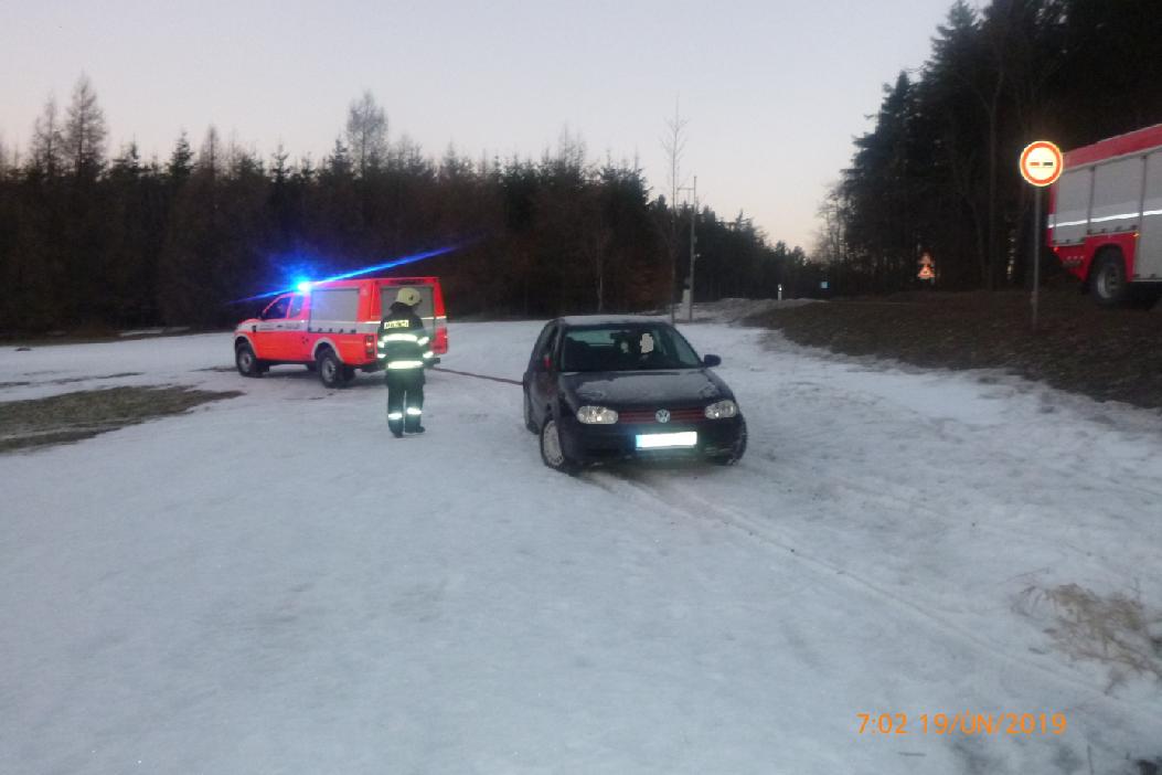 Broumovští profesionální hasiči vyjeli ráno k osobnímu vozidlu, které havarovalo do příkopu mezi Broumovem a Pěkovem. Hasiči pomocí navijáku vůz vyprostili. Nehoda se obešla bez zranění.