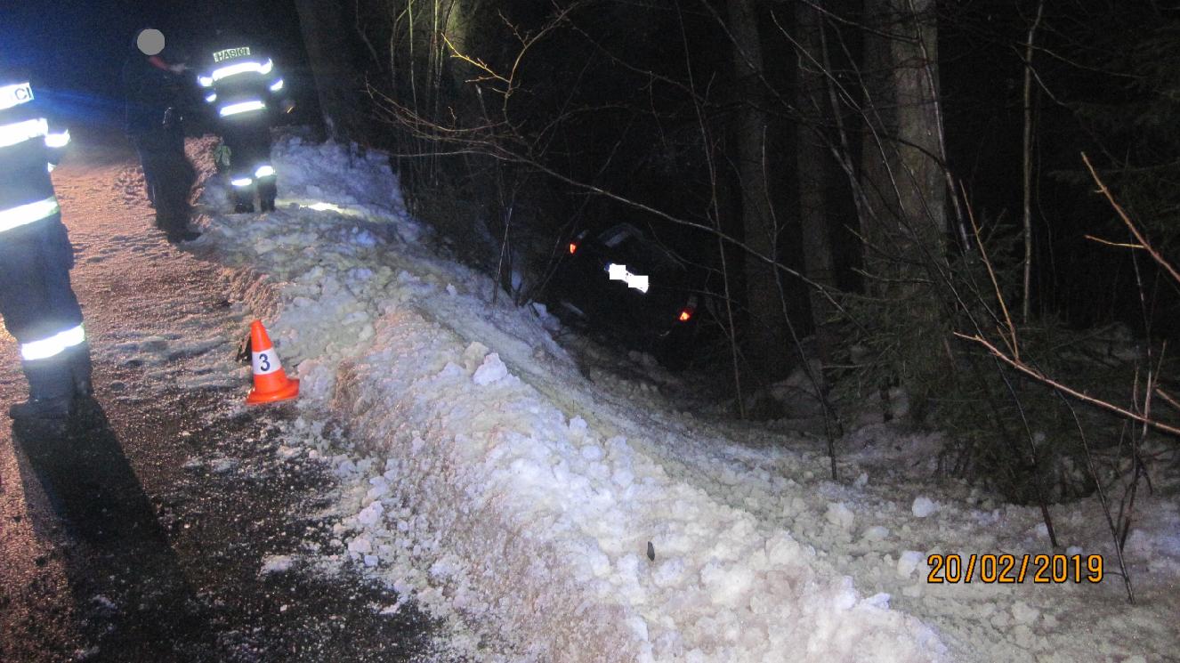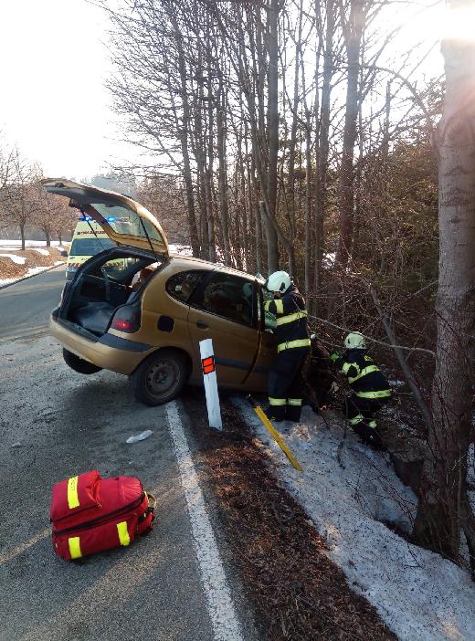 Dobrušští profesionální hasiči a dobrovolní hasiči z Deštné v Orlických horách vyjeli večer k havárii osobního vozidla. Automobil vyjel poblíž Sedloňova na zledovatělé vozovce mimo komunikaci. Dvě osoby byly zraněny. Zdravotnická záchranná služba je ošetřila a odvezla do nemocnice. Hasiči provedli na voze protipožární opatření. V místě nehody řídili hasiči dopravu a provizorně provedli posyp komunikace.
