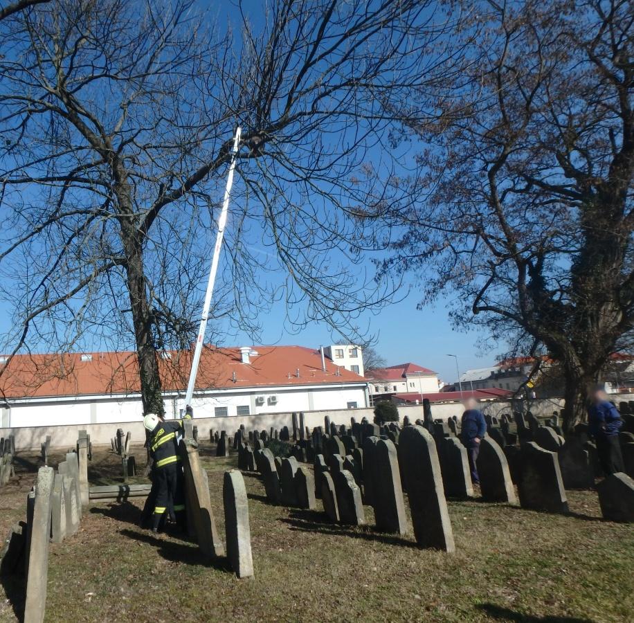 Na Revoluční třídě zachraňovali hasiči v areálu hřbitova kočku z několikametrové výšky na stromě.