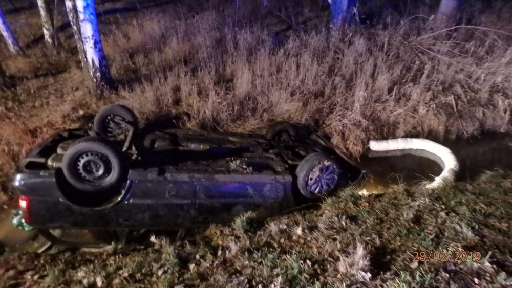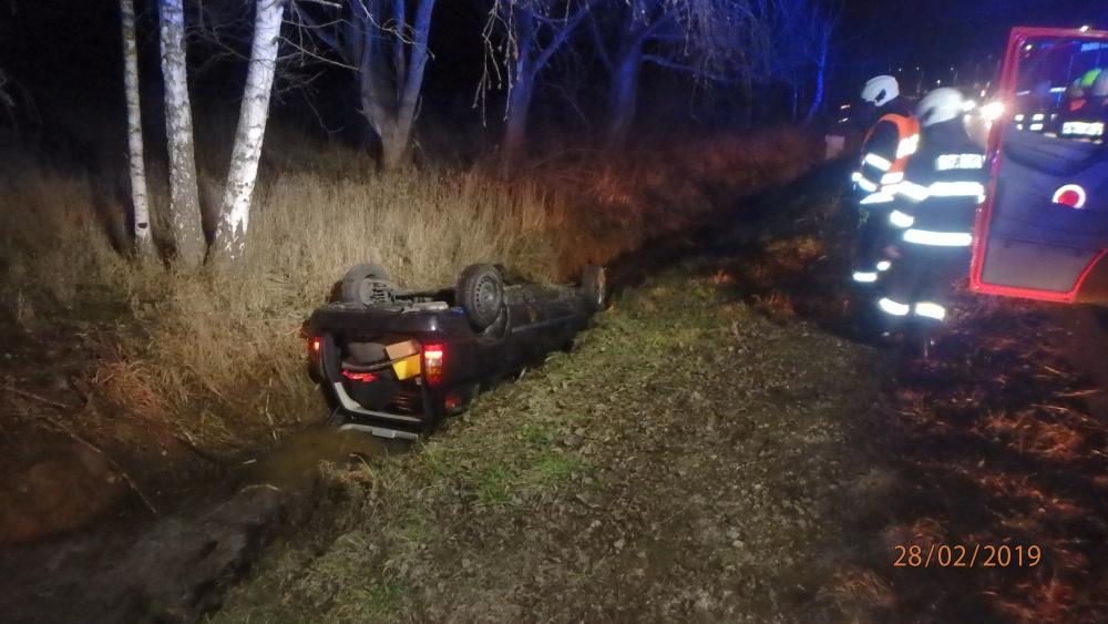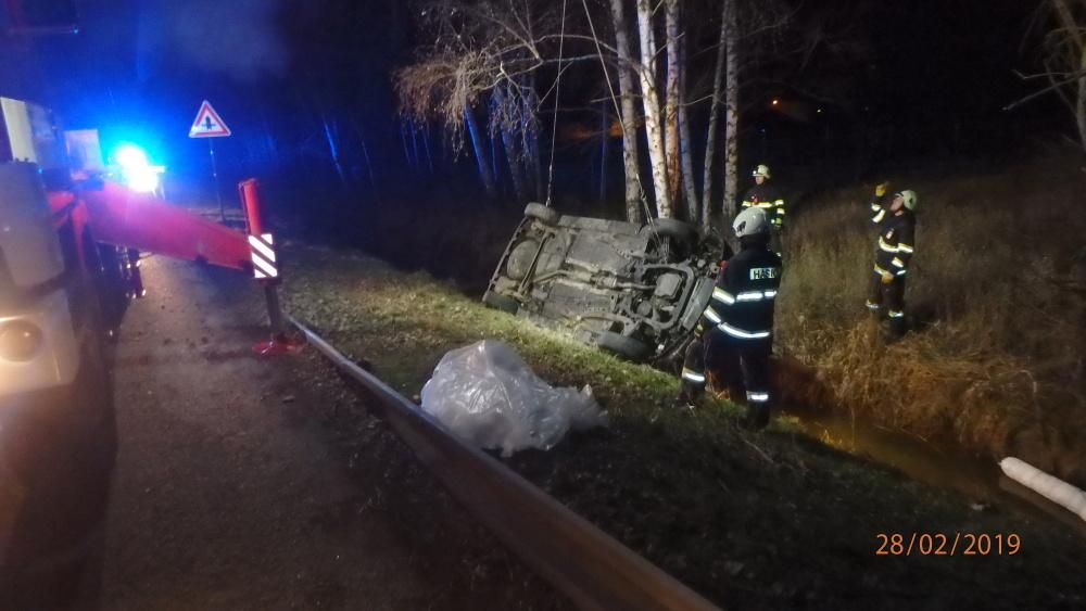 V ulici V. Opatrného na silnici č. I/11 se stala dopravní nehoda osobního vozidla, které se převrátilo na střechu a skončilo v příkopu ve strouze.