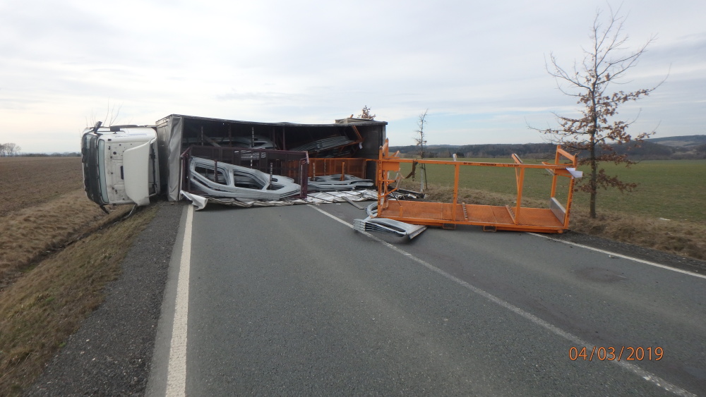 V katastru obce Lokot havaroval před polednem na silnici č. 321 nákladní automobil s vlekem. Vůz skončil po nehodě převrácený na bok napříč komunikací a tvořil překážku v provozu. Na místo události byly vyslány tři jednotky hasičů.