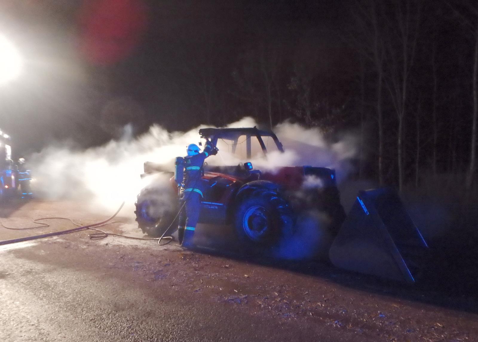 Profesionální jednotka z Nového Bydžova a dobrovolná jednotka z Chlumce nad Cidlinou hasily požár nakladače zn. Manitou. Požár likvidovali hasiči dvěma vodními proudy, stroj byl kompletně uhašen kolem 3. hodiny ranní. Po likvidaci plamenů začal ze stroje unikat hydraulický olej, látku hasiči zachytávali a obsypali místo úniku sorbentem.