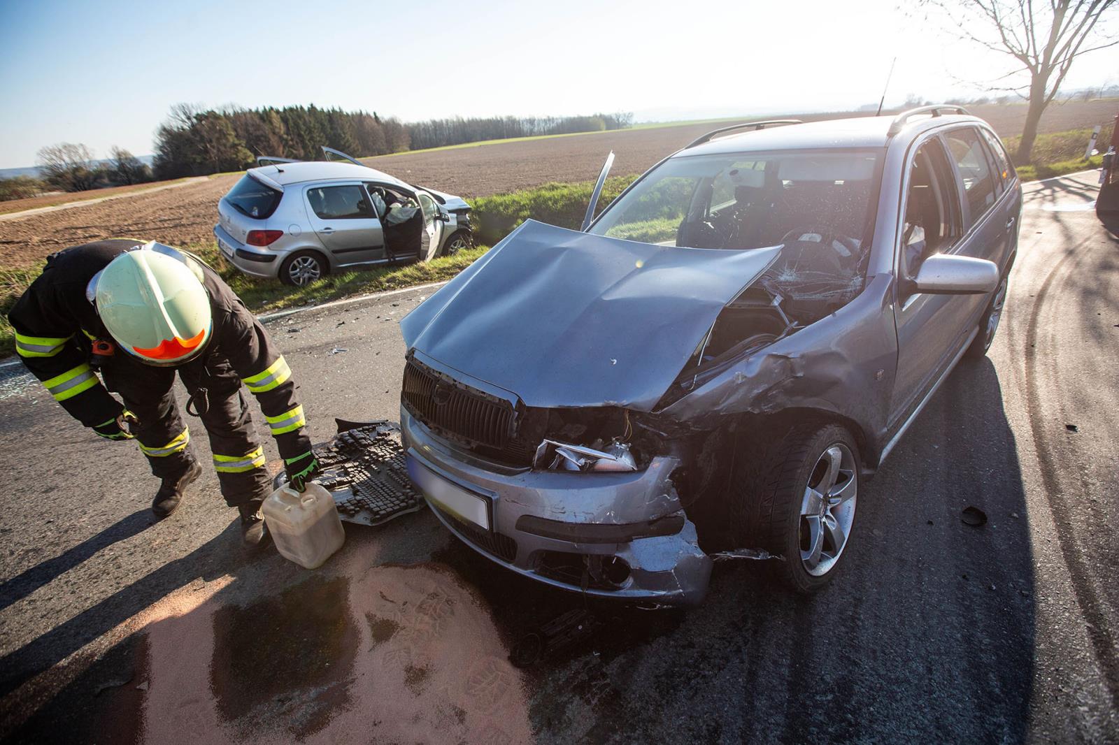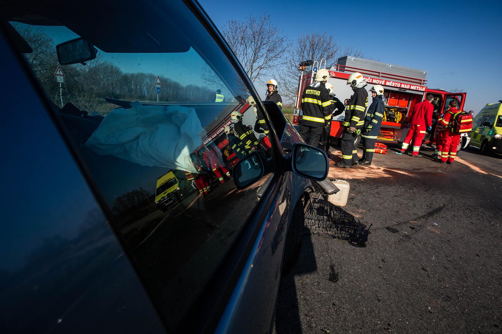Jedno z nich zůstalo stát v křižovatce, kde blokovalo provoz na silnici, a druhý automobil zůstal po nárazu mimo komunikaci. Hasiči místo události zajistili, provedli opatření proti vzniku požáru a zasypali uniklé provozní náplně sorpčním materiálem. Při nehodě došlo ke zranění čtyř osob, všechny si převzali do péče zdravotničtí záchranáři. Hasiči nakonec pomohli s naložením jednoho z vozidel na odtah a doklidili povrch vozovky.
