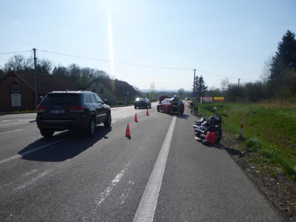 Člověk, který jel na motocyklu, byl zraněn, do péče si jej převzali záchranáři. Hasiči dále zajistili úklid vozovky a naložili poškozenou motorku na odtah.