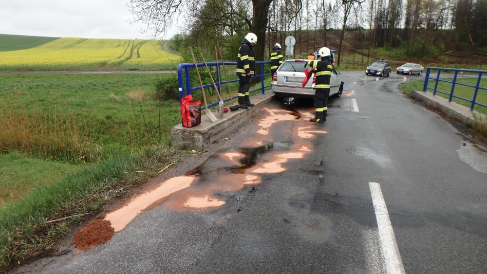 Nehoda se obešla bez zranění. Uniklé provozní kapaliny zasypali hasiči sorbentem.