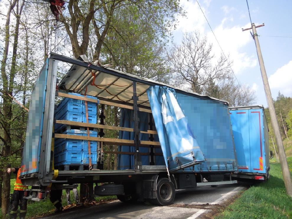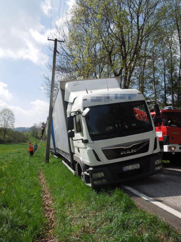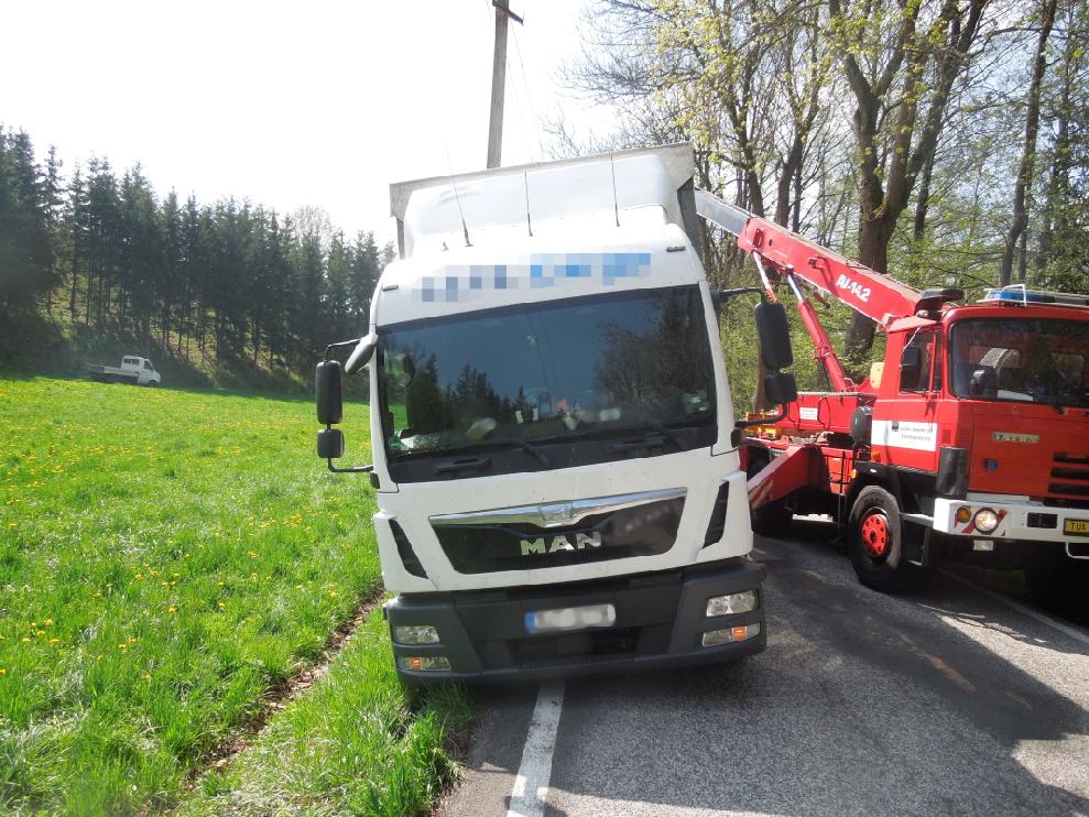 Trutnovští profesionální hasiči odstraňovali následky dopravní nehody nákladního vozidla s návěsem, která se stala na silnici mezi Chotěvicemi a Čermnou. Automobil sjel pravou stranou částečně mimo komunikaci, souprava byla bez nákladu. Zároveň bylo zjištěno, že se návěs opírá o sloup elektrického vedení. Na místo byl vyslán z trutnovské stanice vyprošťovací automobil. Před vyproštěním bylo nutné, aby technici energetické společnosti zajistili proti případnému pádu sloup elektrického vedení. Hasičům se následně podařilo vozidlo i návěs vyprostit zpět na komunikaci.