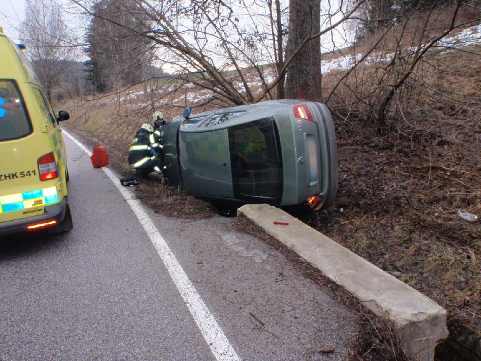 V katastru části Radkyně havaroval osobní automobil, při nehodě byla zraněna jedna osoba. Vůz skončil mimo komunikaci převrácený na bok.