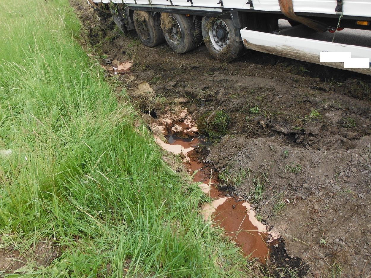 Palivo uniklo z kamionu, který sjel do příkopu. Hasiči únik zasypali sorbentem. Provoz byl v místě žízeň kyvadlově jedním pruhem. Byla vyrozuměna Správa a údržba silnic o úniku několika desítek litrů od příkopu s nutností zeminu vybagrovat.