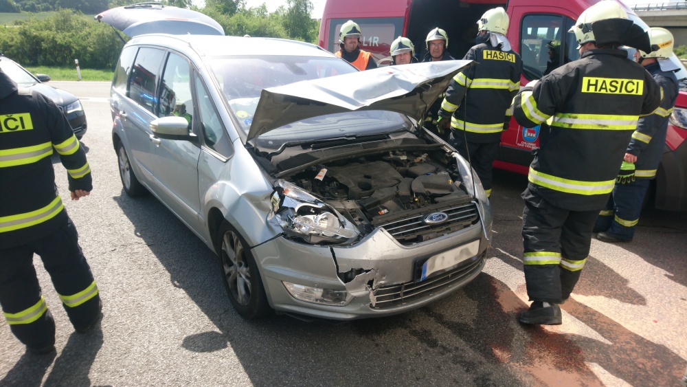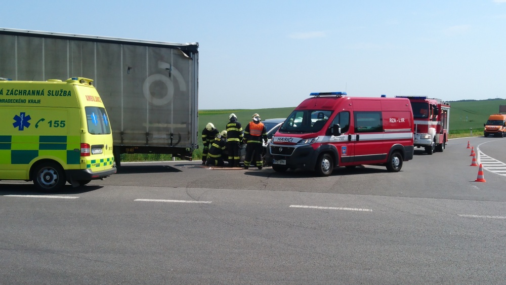 Na výjezdu z dálnice směrem na Chýšť havaroval osobní automobil a kamion. Jedna osoba byla při nehodě zraněna. Na místě zasahovali profesionální hasiči z Nového Bydžova a dobrovolná jednotka z Chlumce nad Cidlinou. Jednotky zabezpečily místo zásahu a postaraly se o odstranění následků nehody.