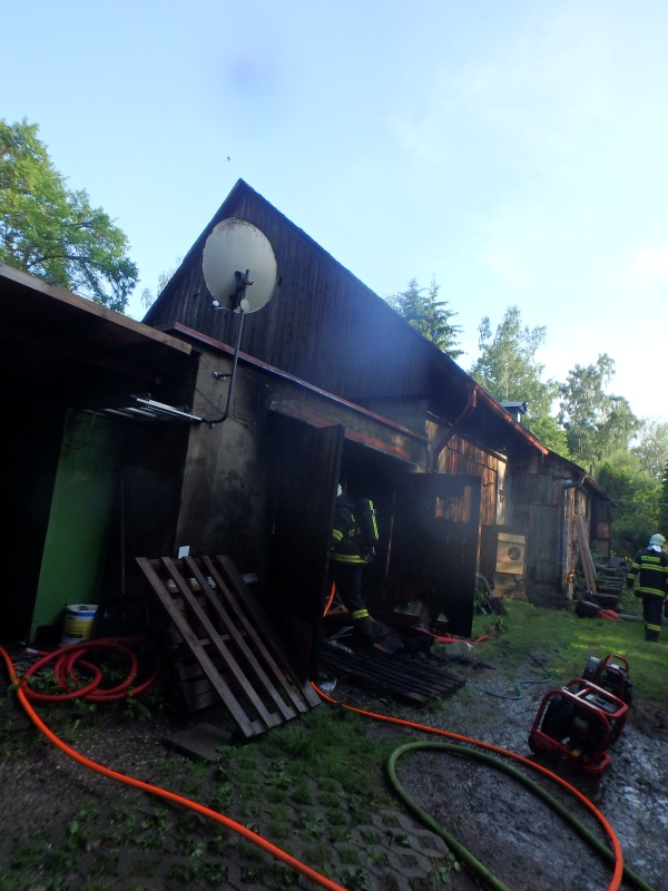 Čtyři jednotky hasičů likvidovaly požár garáže v blízkosti rodinného domu v části Strážkovice. Požár byl nahlášen na operační středisko hasičů v 18:30 hod. s tím, že v zasažené garáži se nachází tlakové lahve i benzín, a v blízkosti je také zaparkované osobní vozidlo. Při příjezdu hasičů na místo události byla zasažena pouze garáž.
