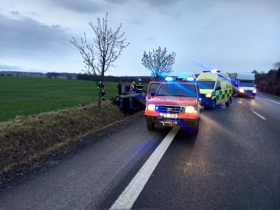 Profesionální jednotka z Dobrušky zasahovala u dopravní nehody osobního automobilu, který havaroval na silnici č. 14. Automobil skončil převrácený na střechu mimo komunikaci, při nehodě byl jeden člověk zraněn. Hasiči pomohli se zajištěním místa události, zabezpečili havarované vozidlo proti vzniku požáru a zkontrolovali, zda nedochází k úniku provozních náplní. Při nehodě bylo poškozeno dopravní značení.