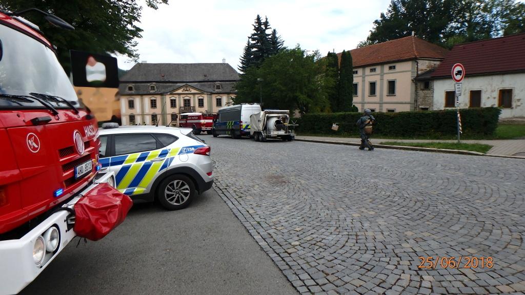 bezpečnou zónu ve vzdálenosti desítek metrů. Z bezprostřední blízkosti objektu bylo evakuováno několik osob. Jednotky pomáhaly policistům se zajištěním místa události, a to až do příjezdu pyrotechnické služby. Po vyzvednutí trhaviny a naložení do speciálního vozu asistovali hasiči policistům při přejezdu na místo bezpečného odpalu výbušniny a také při samotném zneškodnění.