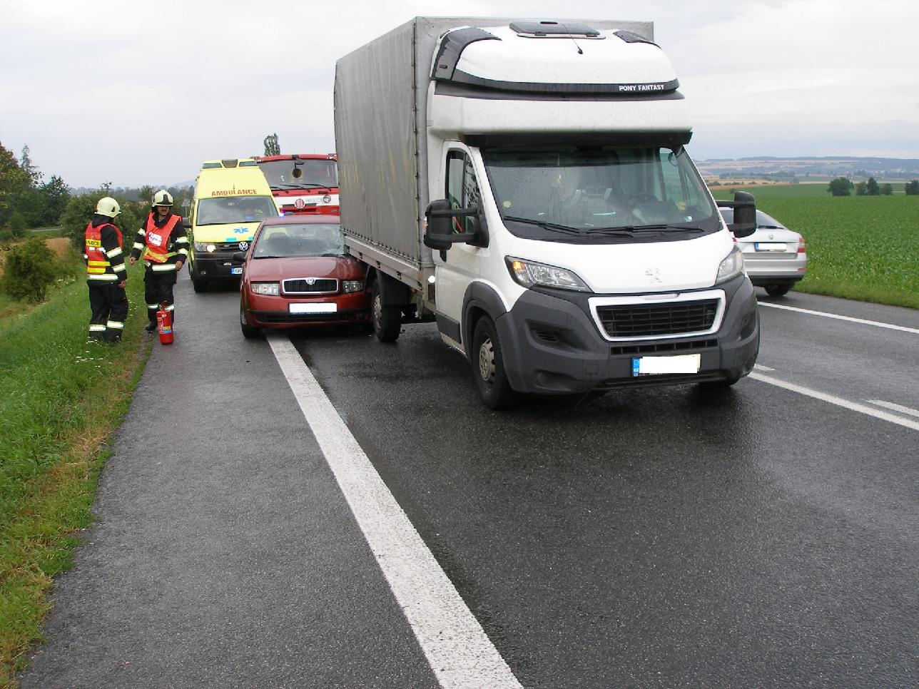 Profesionální hasiči z Hradce Králové z centrální stanice vyjeli v poledne k dopravní nehodě dvou osobních vozidel, která se stala v ulici Břetislavova. V jednom z vozů cestovala těhotná žena. Na místo byla přivolána zdravotnická záchranná služba, aby ženu prohlédla. Ke zranění nedošlo. Jednotka odstavila automobil mimo vozovku.