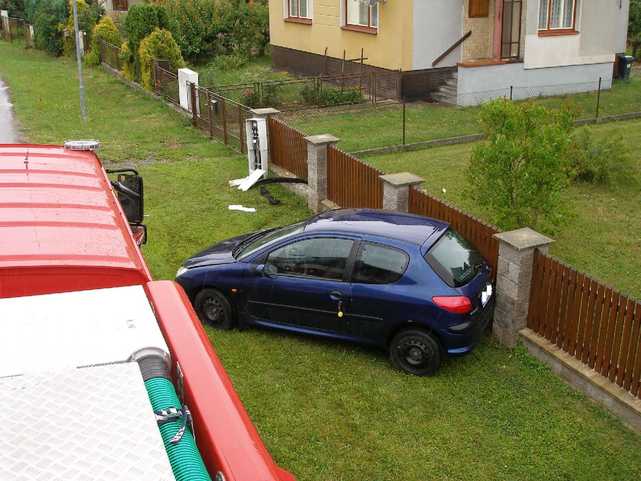 Profesionální hasiči z Hořic byli po poledni přivoláni do ulice Domoslavická k osobnímu vozidlu, s nímž řidička havarovala do plotu a elektrického rozvaděče.