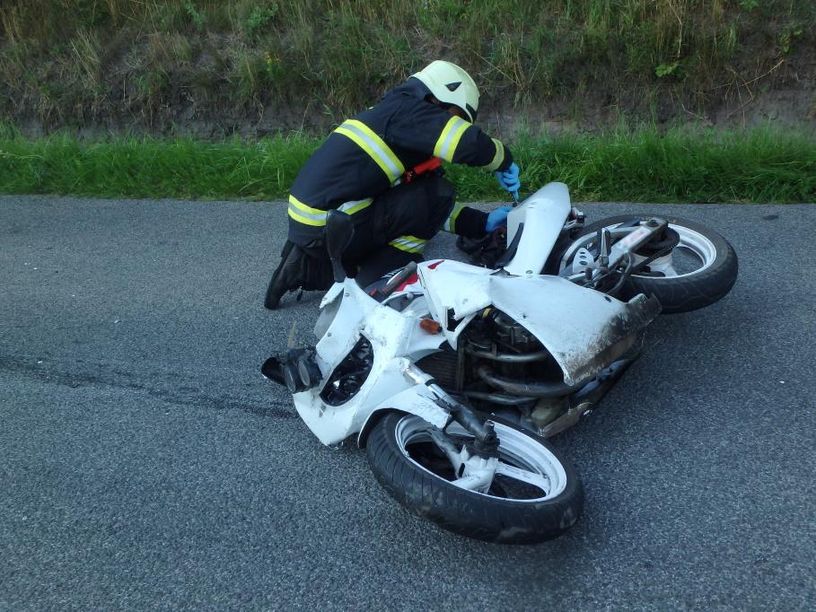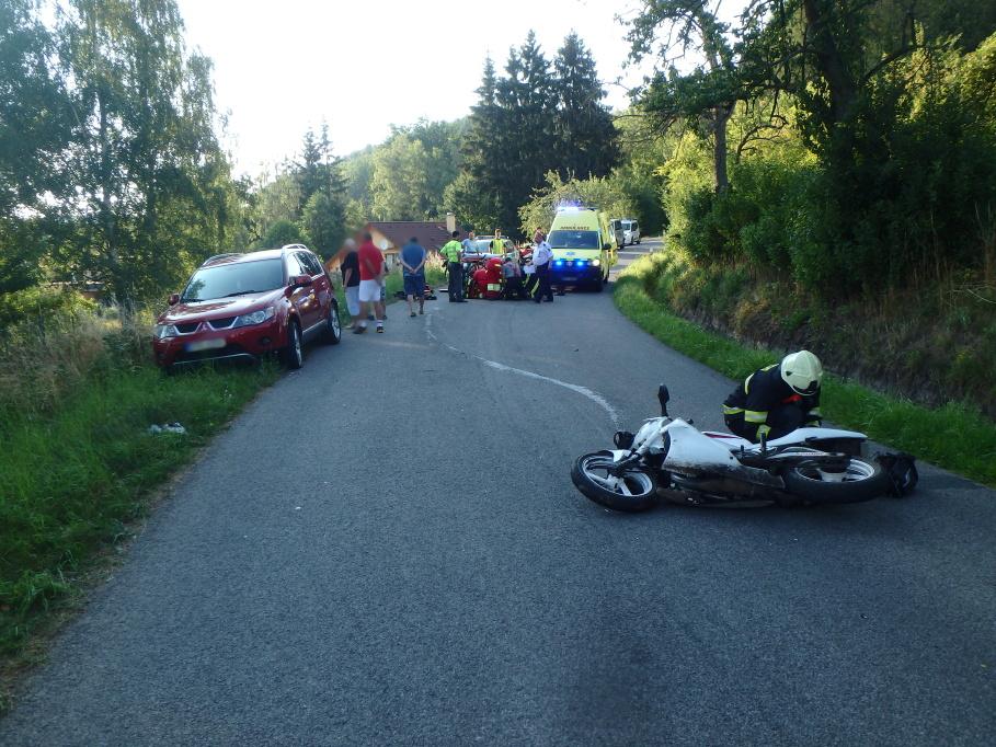 Profesionální hasiči z Náchoda zasahovali v ulici Jiřího z Poděbrad u nehody motocyklu a osobního vozidla. Při nehodě došlo ke zranění motorkáře, kterého si převzali do péče záchranáři. Hasiči asistovali posádce ZZS při ošetření pacienta. Dále místo nehody zajistili, provedli na havarovaném motocyklu protipožární opatření a poté předali místo události k došetření nehody policistům.