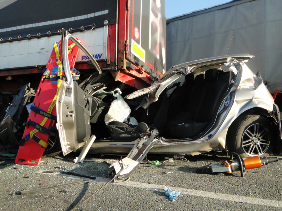 Průzkumem místa hasiči zjistili, že se mezi dvěma nákladními vozy nachází značně poškozené dva osobní automobily, ze kterých bylo potřeba vyprostit pět zaklíněných osob. Jeden z osobních vozů zůstal na komunikaci, druhý se nacházel mimo vozovku v příkopu. Hasičům se podařilo všech pět osob dostat pomocí hydraulického vyprošťovacího zařízení ven. Na místě bylo celkem sedm zraněných osob, všechny si převzali do péče záchranáři.