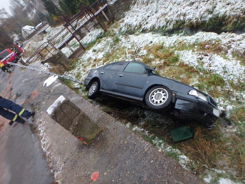 vozovce, protože se zde nacházely první sněhové vločky. Hasičům se podařilo vůz vyprostit a bezpečně s ním dojeli mimo rizikový zasněžený úsek. Zde jej předali zpět majiteli. Nehoda se obešla bez zranění osob.
