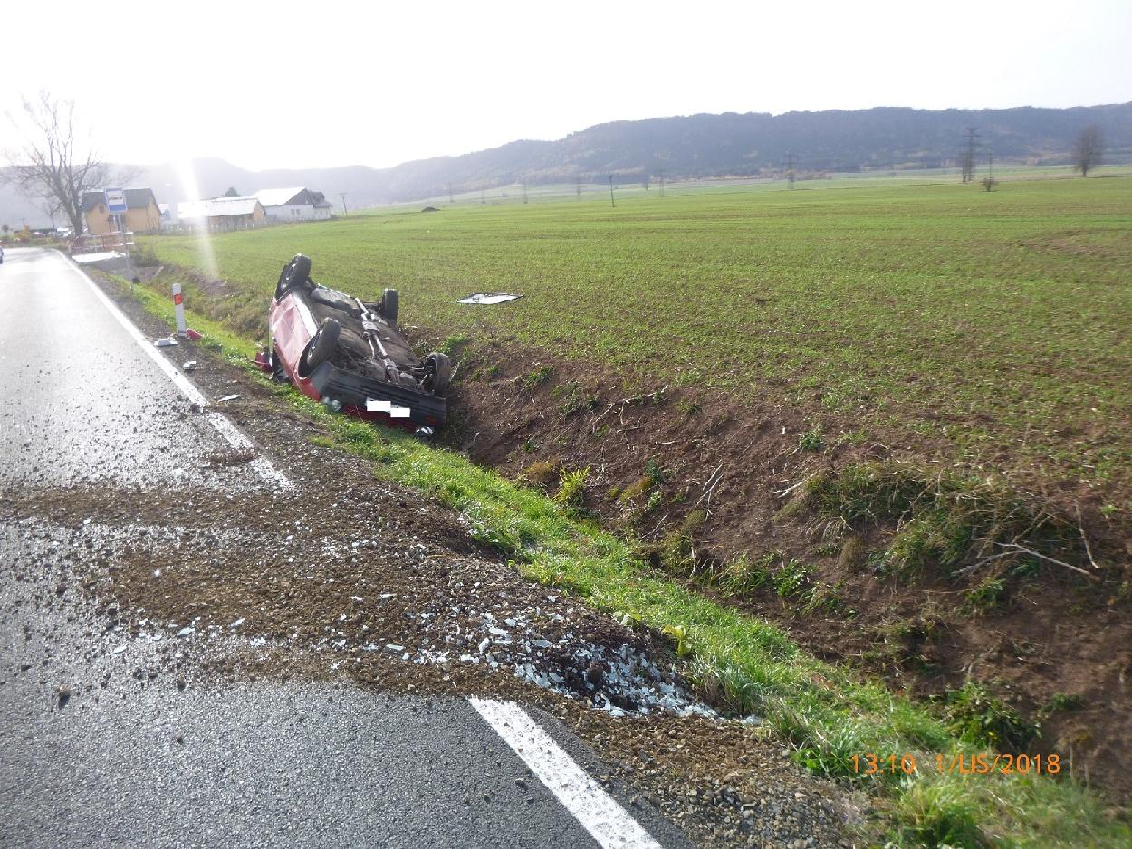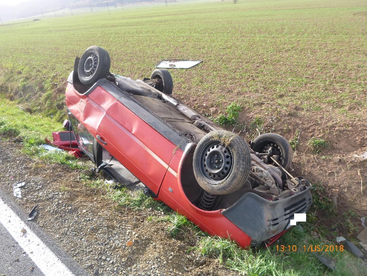 Broumovští profesionální vyjeli po poledne k havárii osobního vozidla, ktríé skončilo převrácené na střeše v příkopu. Jednotka provedla na vozidle protipožární opatření. Zraněná řidička byla po prvotním ošetření odvezena zdravotnickou záchrannou službou do nemocnice.