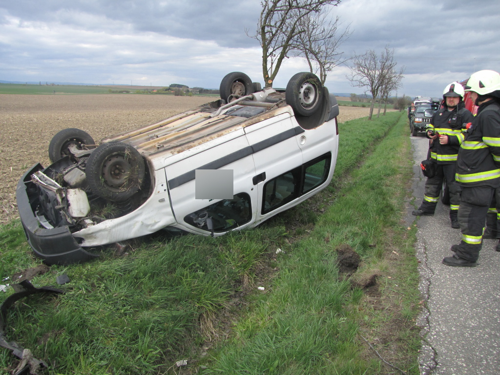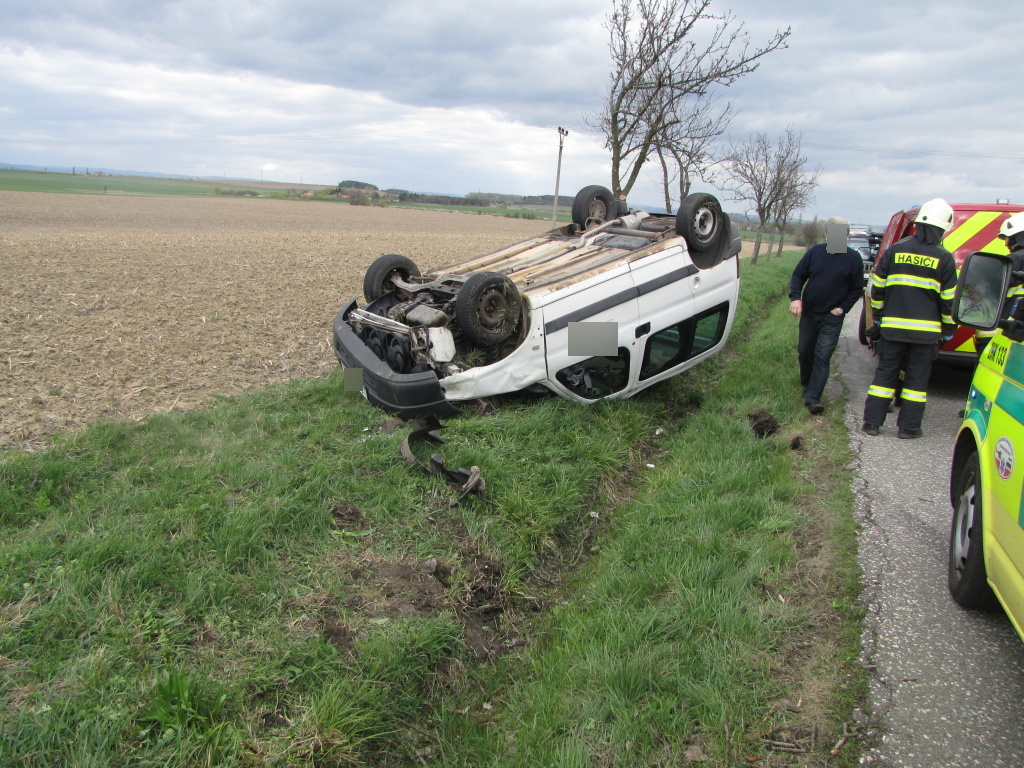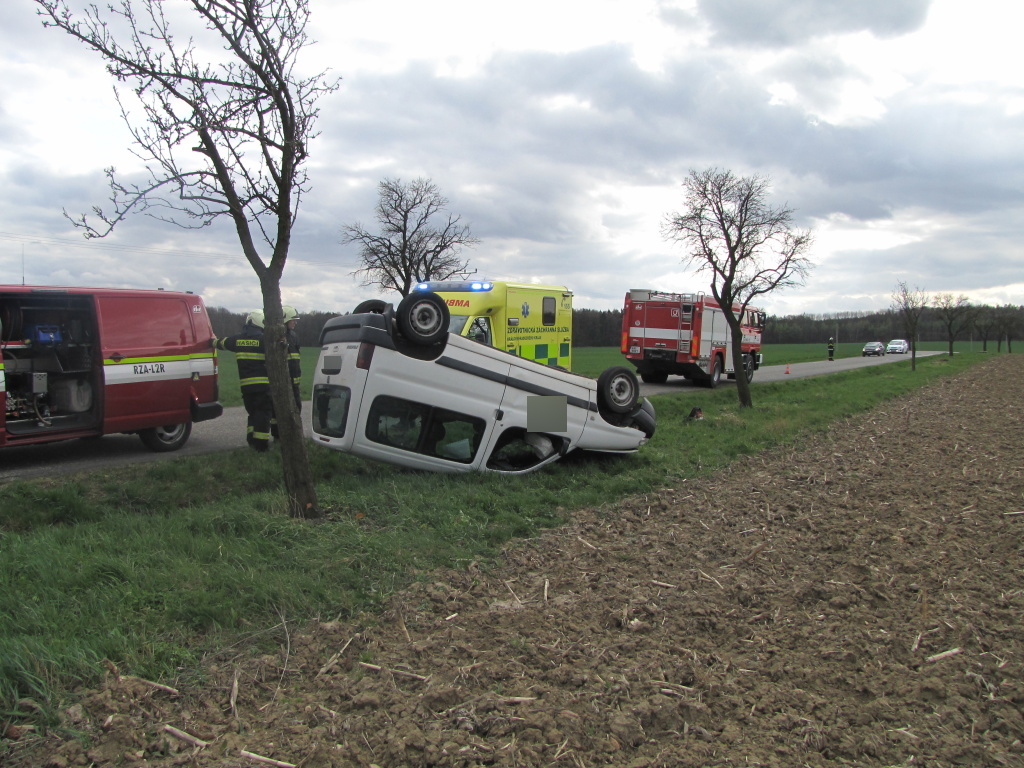 Jednotka profesionálních hasičů z centrální stanice Hradec Králové vyjela v 15:50 hodin k dopravní nehodě, která se stala u obce Divec. Osobní vůz zn. Peugeot Partner z dosud nejasných příčin skončil převrácený na střeše mimo vozovku. Hasiči po příjezdu na místo poskytli předlékařskou pomoc jedné zraněné osobě a po příjezdu záchranářů ji předali do jejich péče. Osobní automobil převrátili na kola a zajistili ho proti požáru. Příčiny nehody šetří Policie ČR. (foto: centrální stanice Hradec Králové)