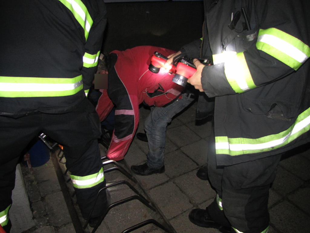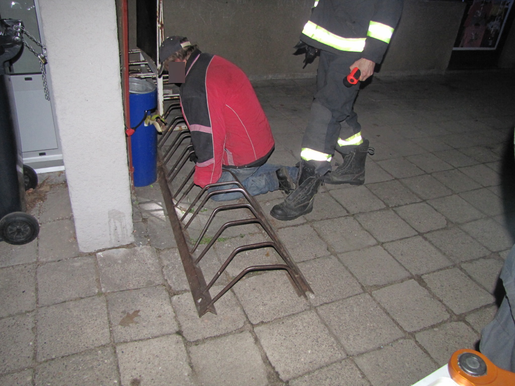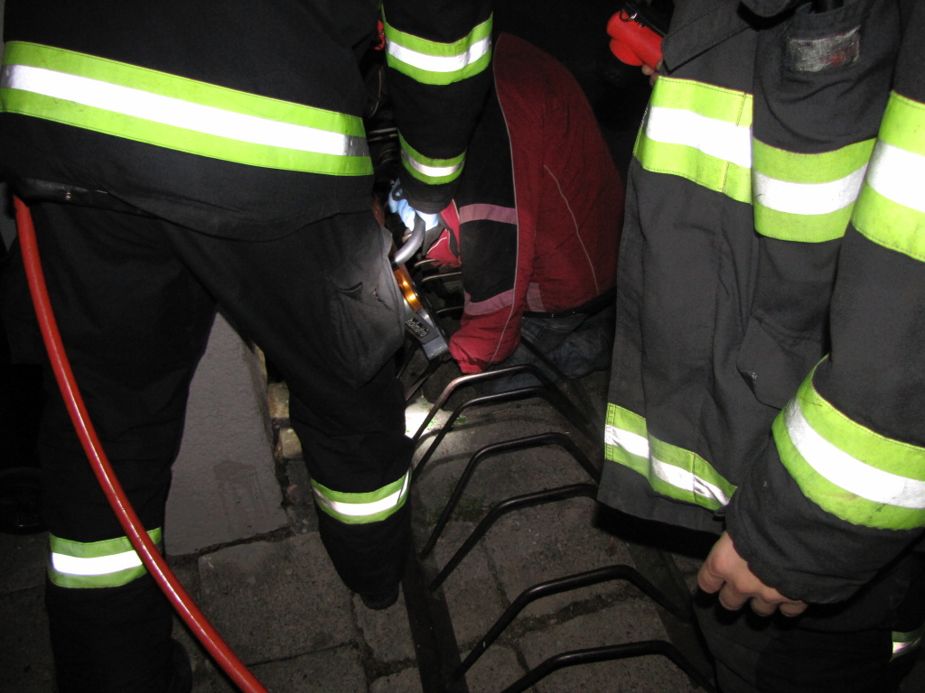V 19:38 hodin byli profesionální hasiči z centrální stanice Hradec Králové přivoláni k neobvyklému zásahu do ulice Gagarinova v Hradci Králové. Vyjeli na pomoc muži, který se kolenem zaklínil do stojanu na kola a nemohl se sám vyprostit. Hasiči museli použít hydraulický rozpínák, kterým rozevřeli stojan a uvolnili zaklíněnou nohu muže. (foto: centrální stanice Hradec Králové)