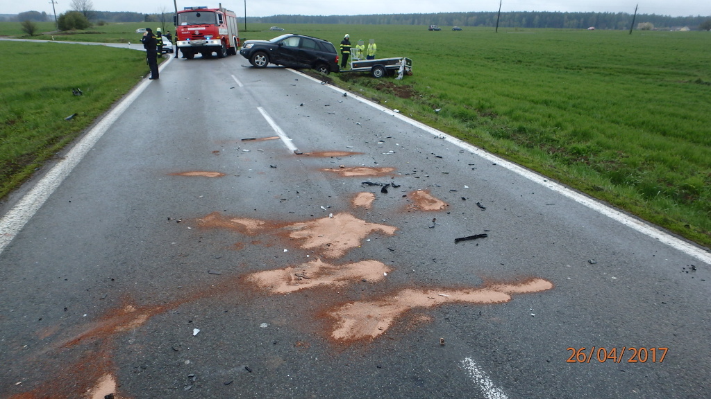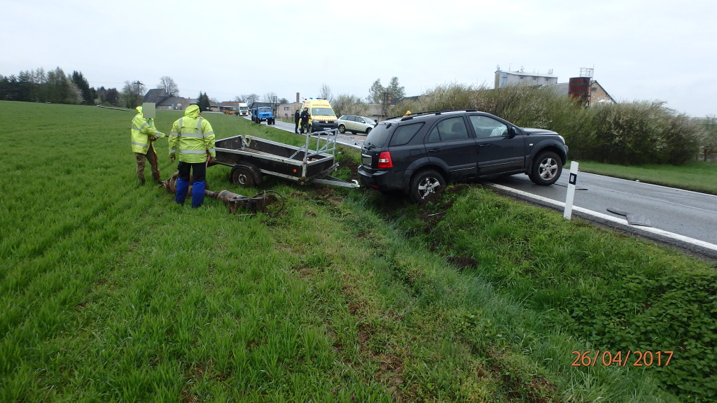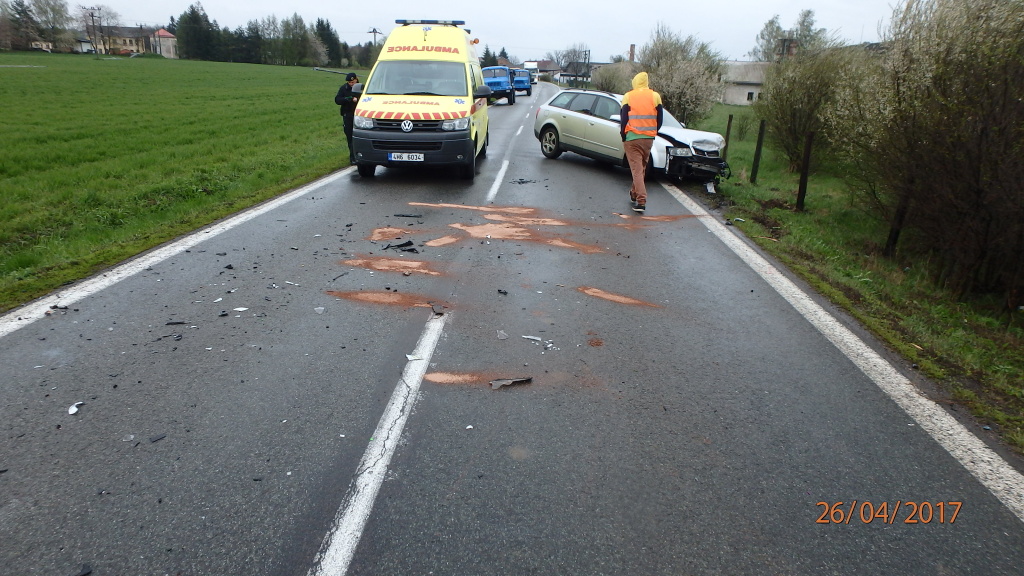 Bez zranění se obešla dopravní nehoda dvou osobních vozidel, ke které došlo včera odpoledne u obce Kocbeře. Na místo události vyjeli ve 13:27 hodin profesionální hasiči ze Dvora Králové nad Labem. Jedno z havarovaných aut s přívěsným vozíkem skončilo částečně mimo vozovku. Hasiči zajistili obě vozidla proti požáru a odpojili autobaterie. Unikající provozní kapaliny zasypali sorbentem a následně očistili z vozovky. Po dobu policejního vyšetřování usměrňovali provoz na objízdnou trasu. Příčiny nehody šetří Policie ČR. (foto: stanice Dvůr Králové nad Labem)