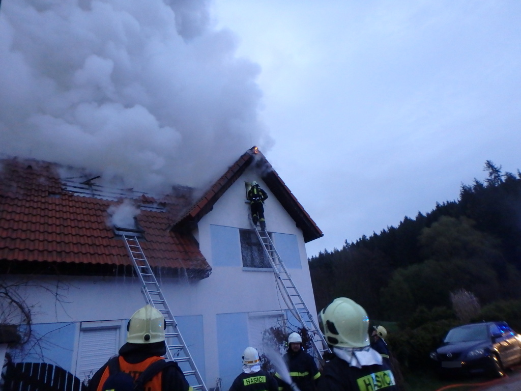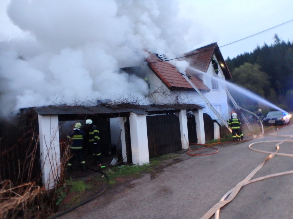 Při příjezdu první jednotky dobrovolných hasičů z Hostinného hořela větší část rodinného domu s přistavěnou garáží. Oheň se rychle šířil z dřevěné garáže na terasu obytného domu, do části podkroví a na střechu. V době vzniku požáru byl rodinný dům neobývaný. Hasiči ihned nasadili několik vodních proudů a požár likvidovali nejen ze země, ale také z nastavovacích žebříků. Plameny se jim podařilo dostat pod kontrolu v 06:30 hodin. Dohašování ohnisek a rozebírání poškozených střešních konstrukcí pokračovalo do 10:04 hodin, kdy byl požár zlikvidován. Už po prvotním ohledání místa vzniku bylo zřejmé, že se s největší pravděpodobností jedná o úmyslné založení. Na místo byli proto povoláni speciálně vycvičení psi na vyhledávání hořlavých látek. Hmotná škoda byla předběžně odhadnuta na jeden milion korun, uchráněné hodnoty činí jeden milion korun. Při požáru ani samotném zásahu nebyl nikdo zraněn. (foto: SDH Hostinné, stanice Trutnov)