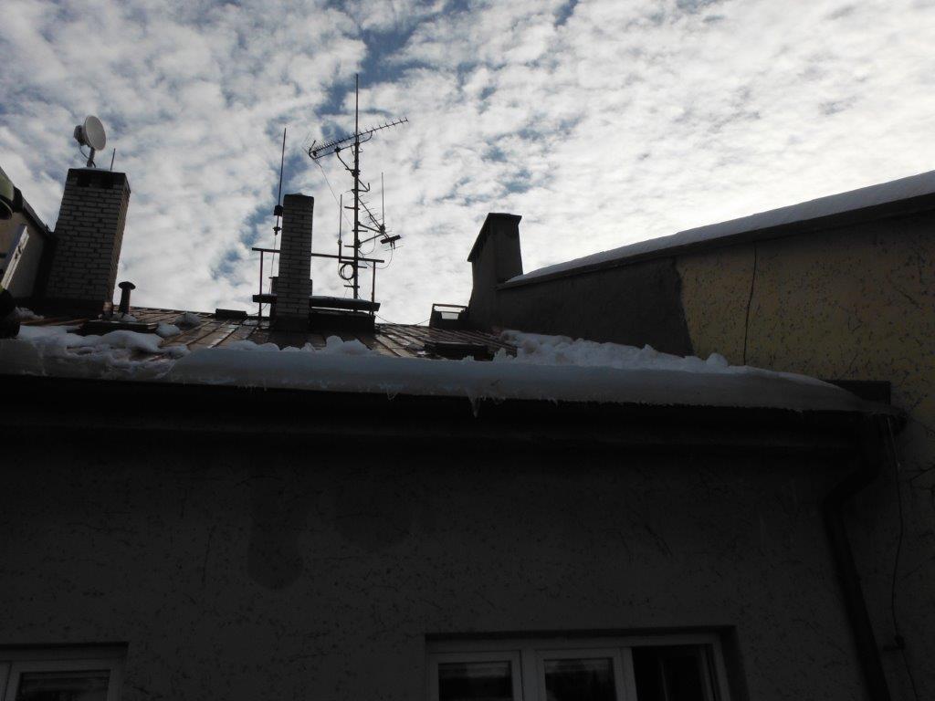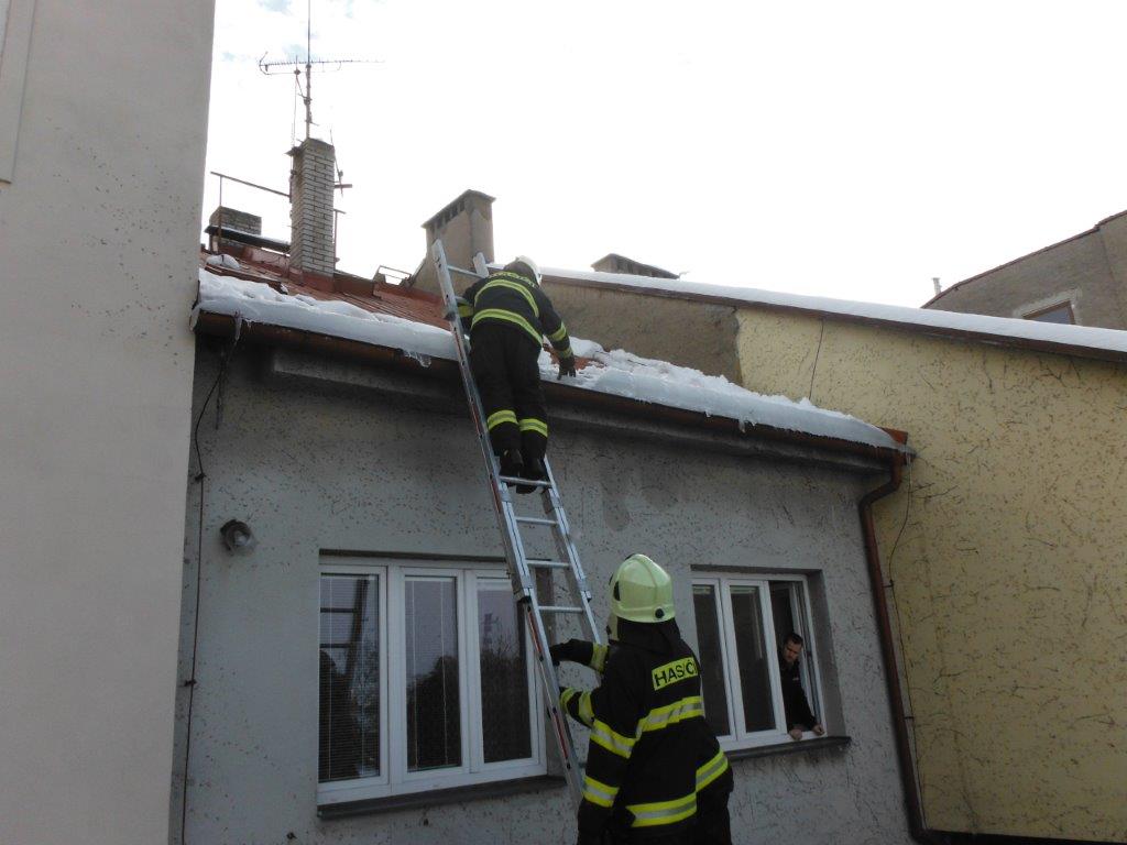 Jaroměřští profesionálové odstraňovali ledové převisy ze střechy budovy zdravotnické záchranné služby v Národní ulici v Jaroměři.
