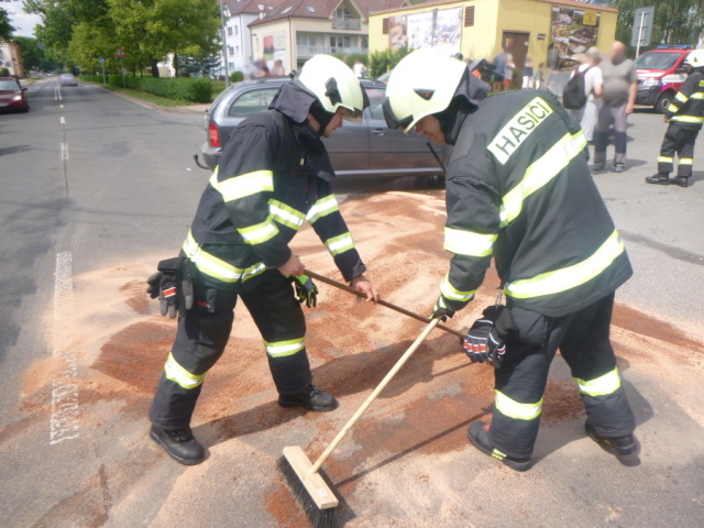 Profesionální hasiči z Broumova odstraňovali v ulici K Ráji olejovou skvrnu z komunikace.